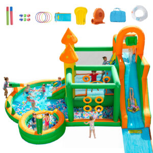 TASKBAY Forest Mushroom Inflatable Bounce House Water Slide Park, 10 in 1 Play Areas with Extended Water Slide, Ball Shooting, Ring Toss, Deep Pool, Water Bucket, for Kids 3-10, Indoor Outdoor Backyard
