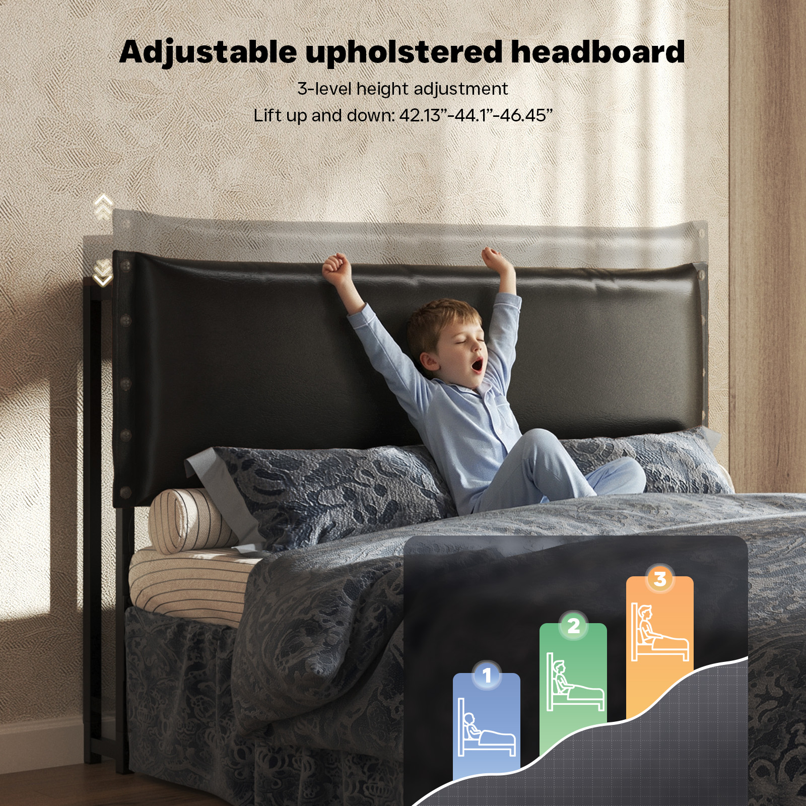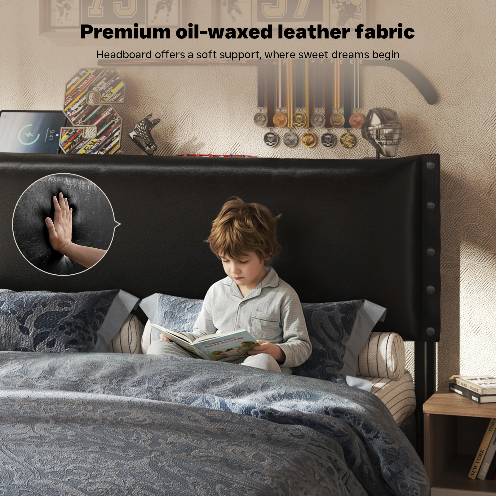 This kid-friendly black oil-waxed leather plush headboard is perfect for your child’s bedroom, blending cozy decor, fun and durability. Its minimalist, cozy design complements various kids’ bedroom styles, elevating charm and creating a comfortable space for your little one’s rest. The plush headboard has fantasy RGB LED lights,various colorful modes, app-controlled for easy brightness/color adjustments to delight your kid. This storage headboard with a charging station organizes kids’ small items and charges devices conveniently. Built with a reinforced wooden frame, the plush headboard is durable, elastic and deformation-resistant, withstanding kids’ daily use. Adjustable height fits most kids’ beds/frames and mattress combinations, making this headboard a great addition to your child’s room.