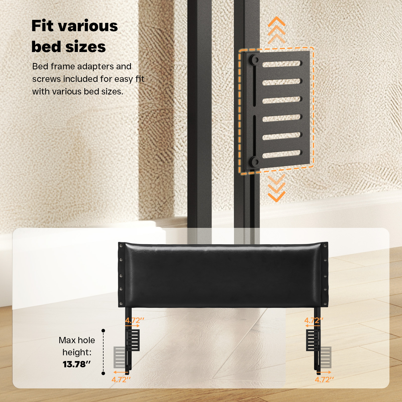 - 【Universal Fit】The bed frame adapters and screws included for easy fit with various bed sizes. The adapter is suitable for bed frames with insufficient width, and for bed frames with leg holes only,round holes, vertical slots and horizontal slots, ensuring the headboard withstands movement and frequent use.