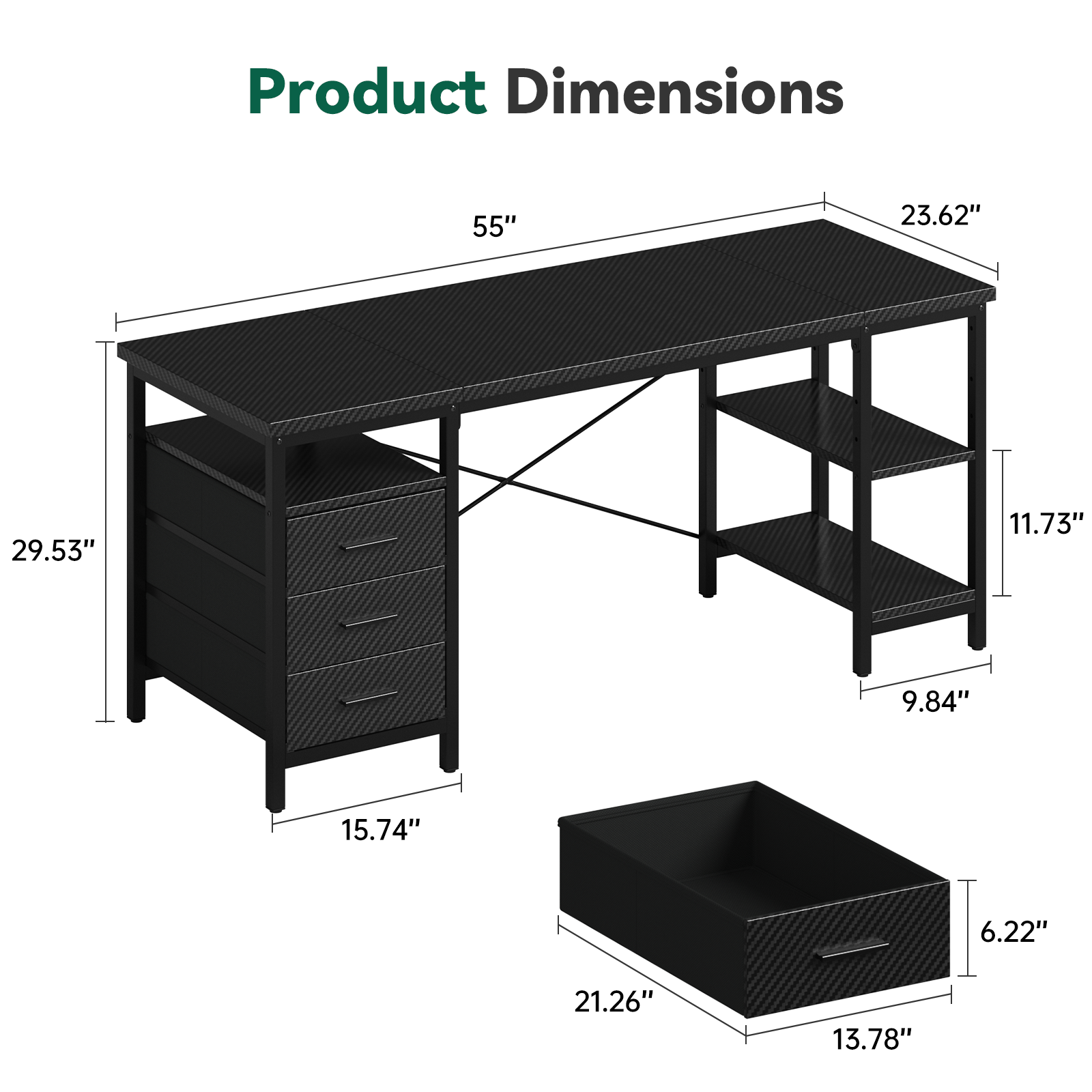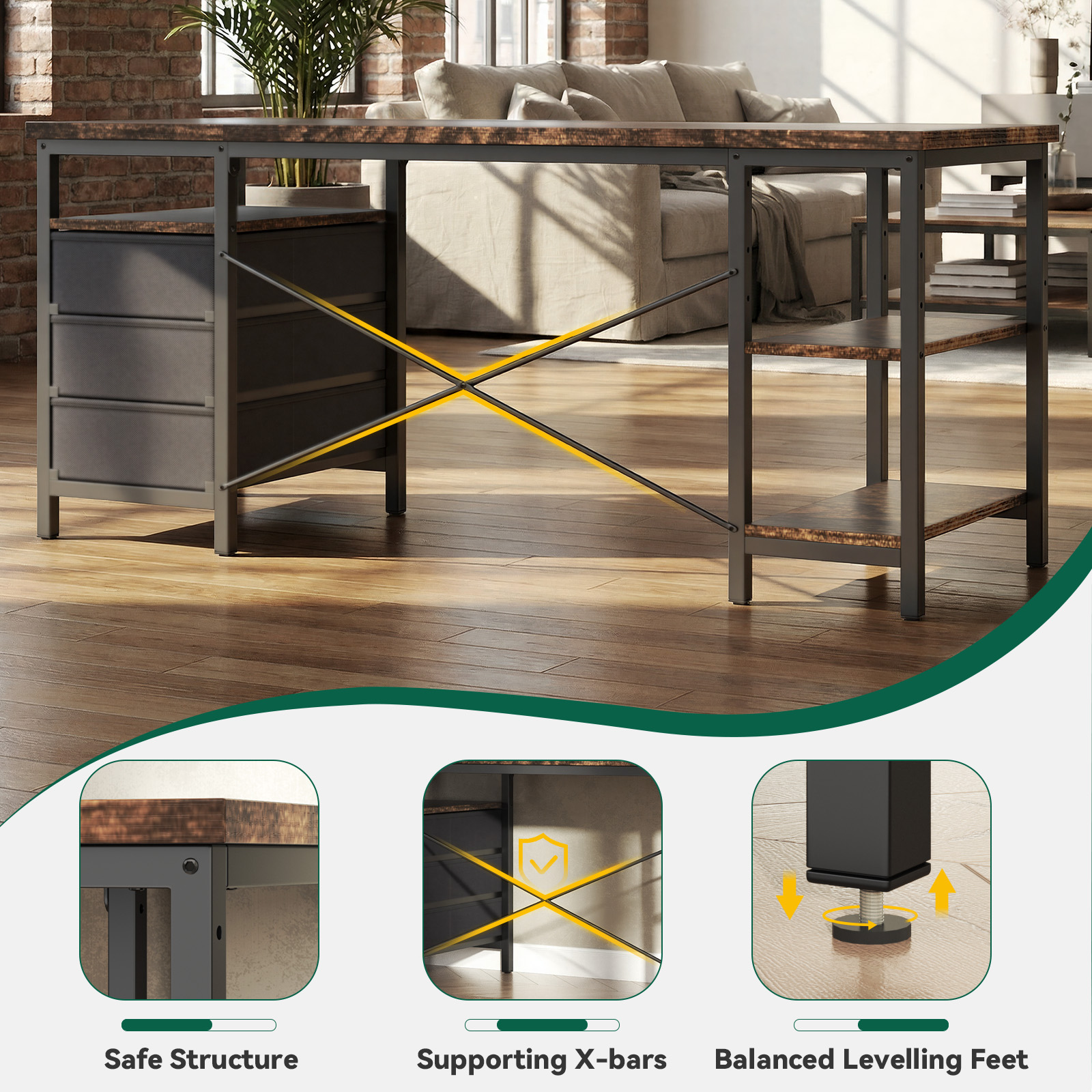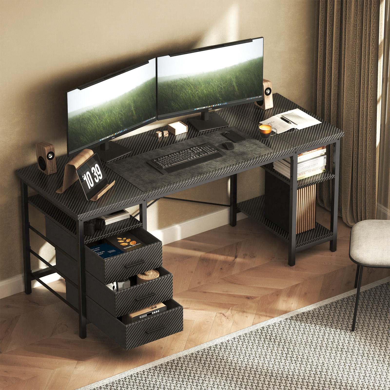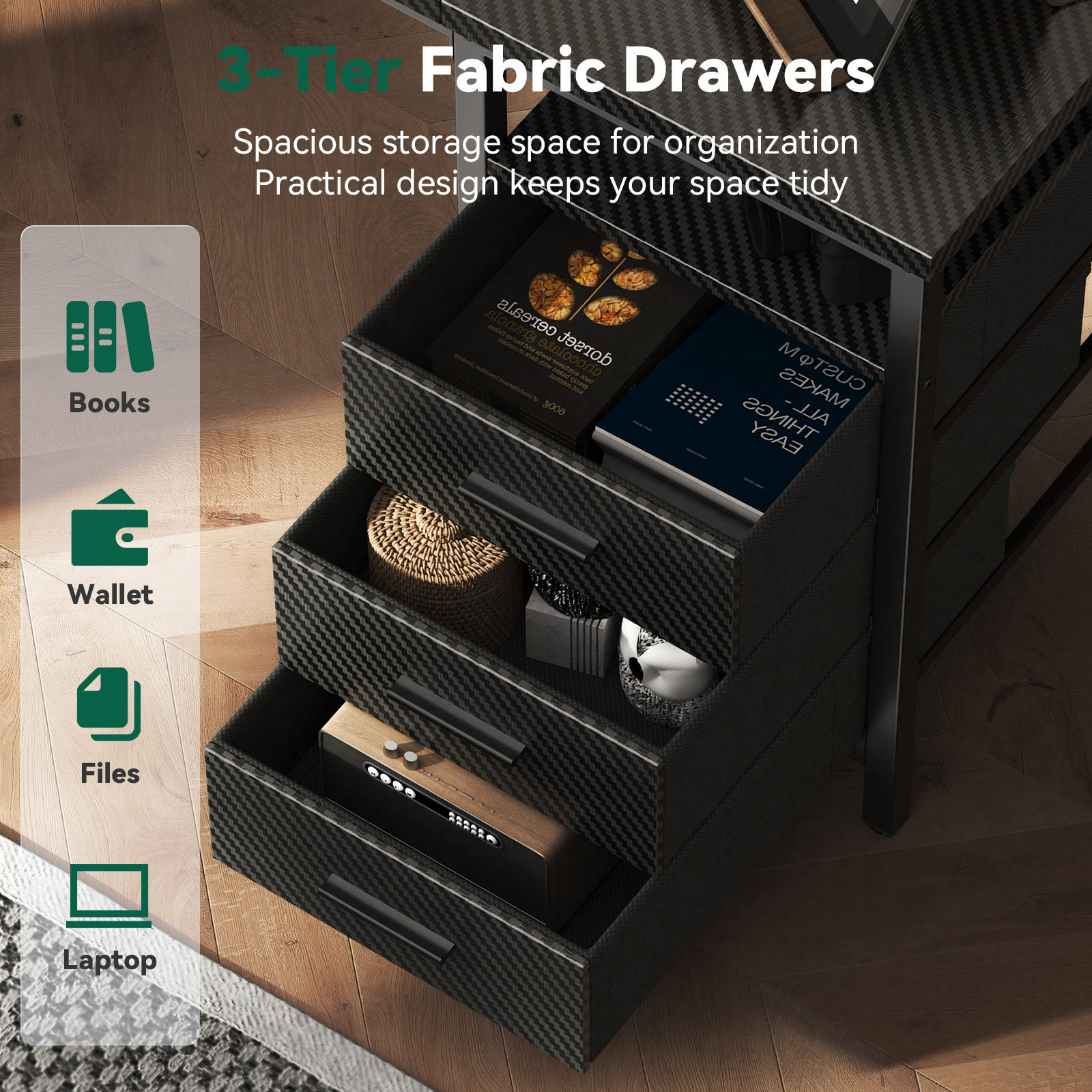 【3-Tier Fabric Drawers】Three spacious fabric drawers offer generous, organized storage for books, wallets, files, and even a laptop, helping you keep your workspace tidy and clutter-free.