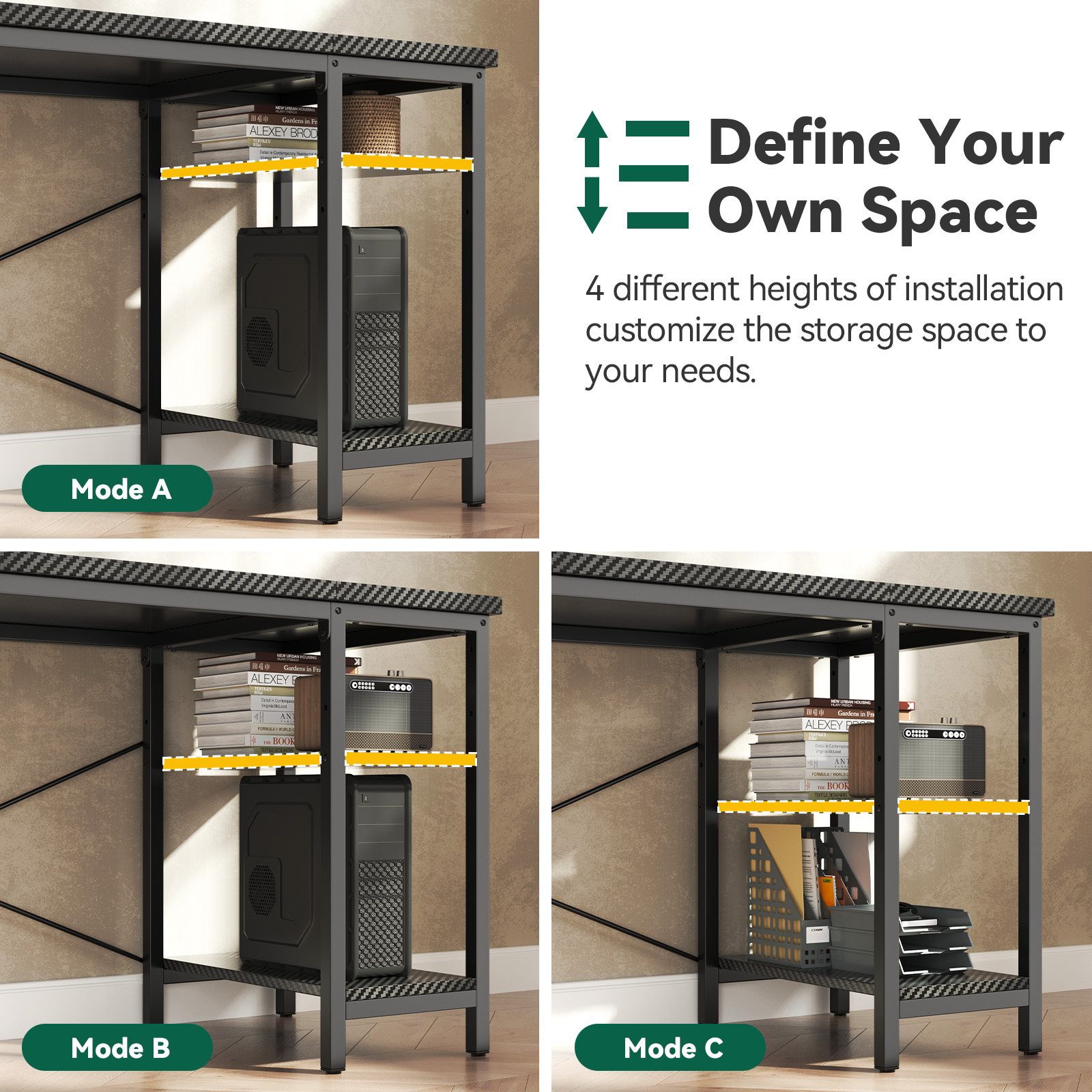 【Versatile Workspace Adaptability】The storage shelf can be installed at 4 different heights, letting you reconfigure the space to accommodate taller items like computer towers, books, or office equipment for maximum versatility.