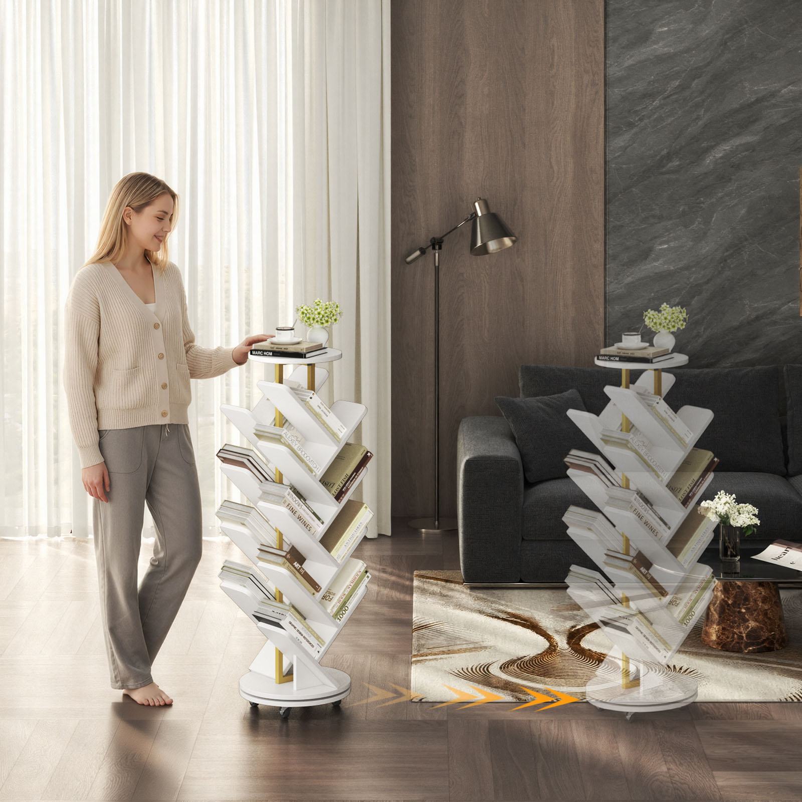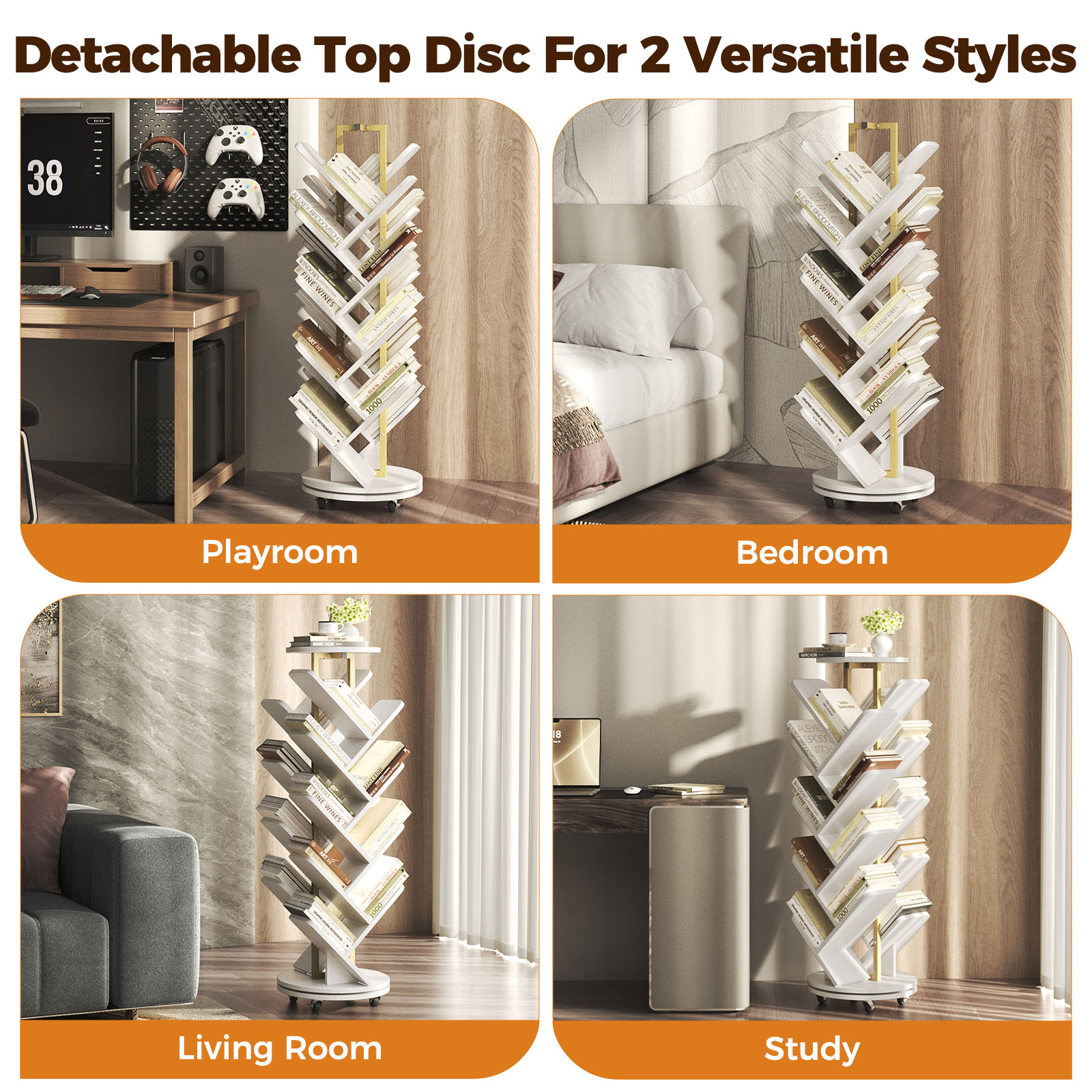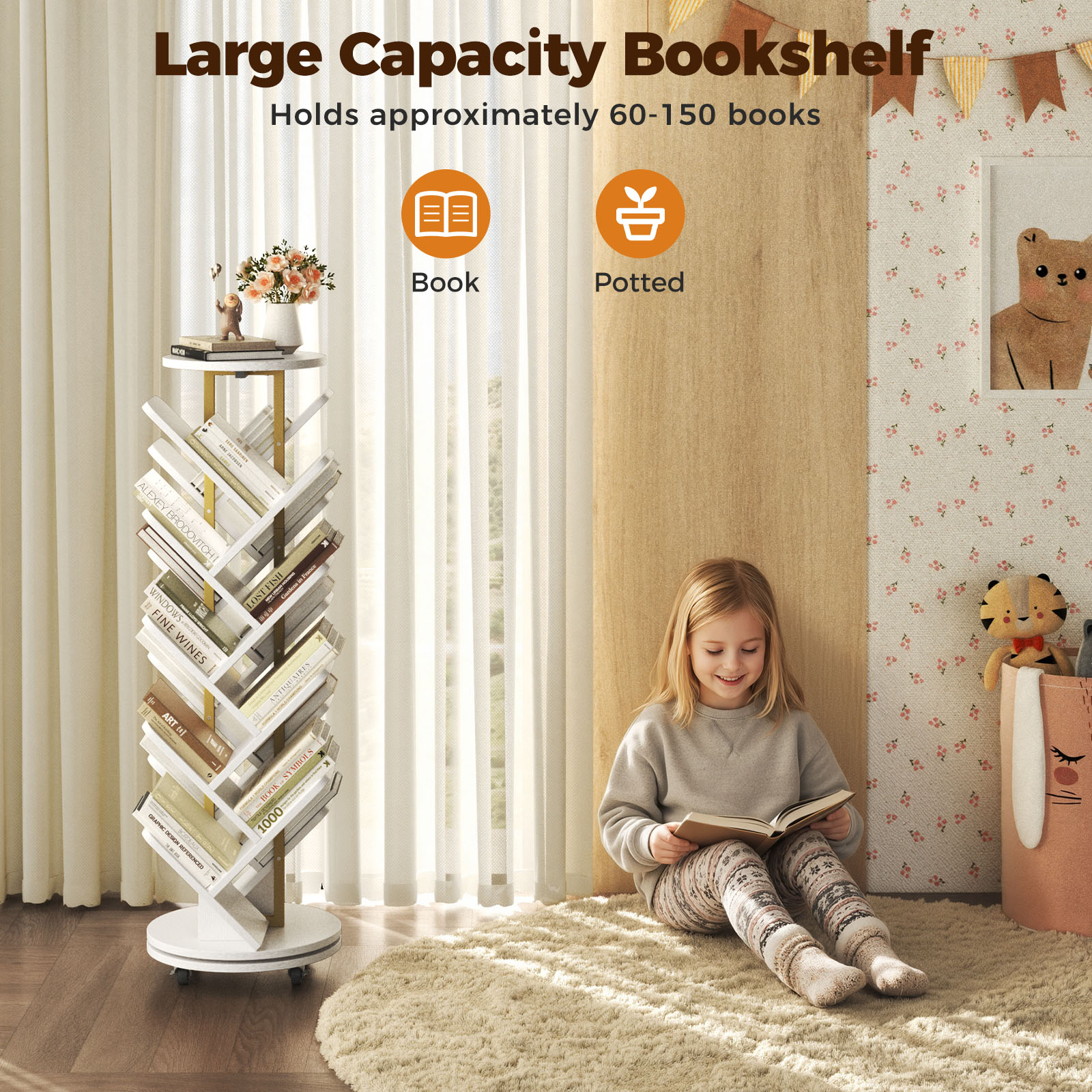 This 16-Tier Tree Rotating Bookshelf combines practical storage and modern style, making it an ideal organizer for any home or office. The revolving bookshelf boasts a slim vertical tower structure that maximizes vertical space while taking up minimal floor area, perfect for small apartments, corners and compact spaces. The generous 16-tier design provides large-capacity storage for various accessories, keeping your space tidy and clutter-free. The spinning bookshelf features a stable and silent 360° rotating base, allowing you to access and browse all items effortlessly without moving. The rotating bookshelf , equips with detachable universal wheels can be easily moved between rooms, and the wheels can be removed for stable stationary placement. Its sleek white finish complements any decor style from minimalist to classic. With versatile storage and functional design, this revolving bookshelf tower brings convenience and order to your daily life.