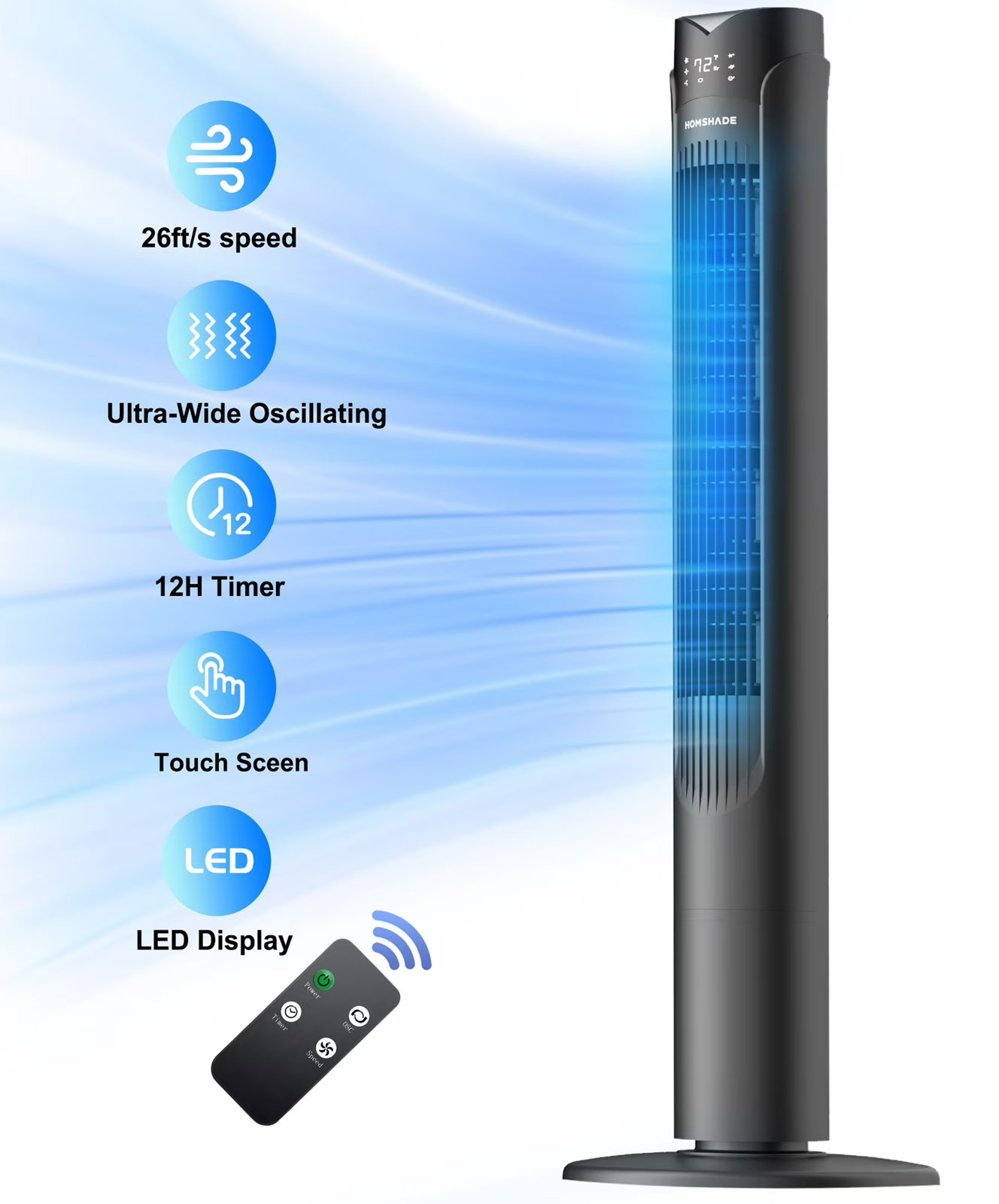 Tower fan air speeds up to 26 feet per second for instant cooling. Only 41 inches tall, making it easy to move around at any time.
