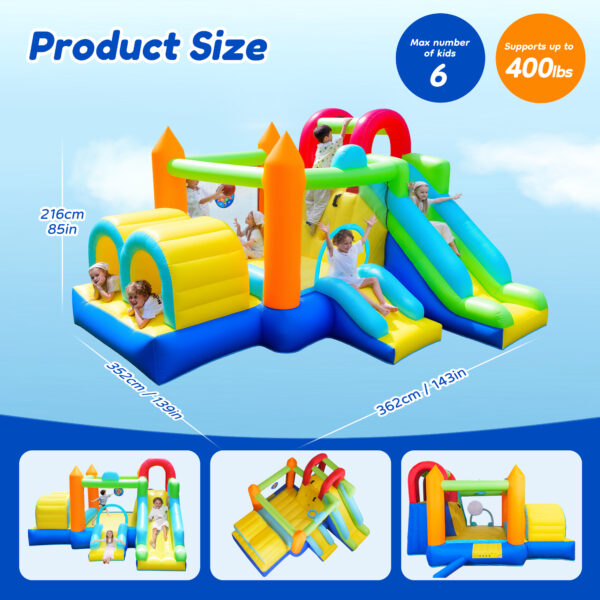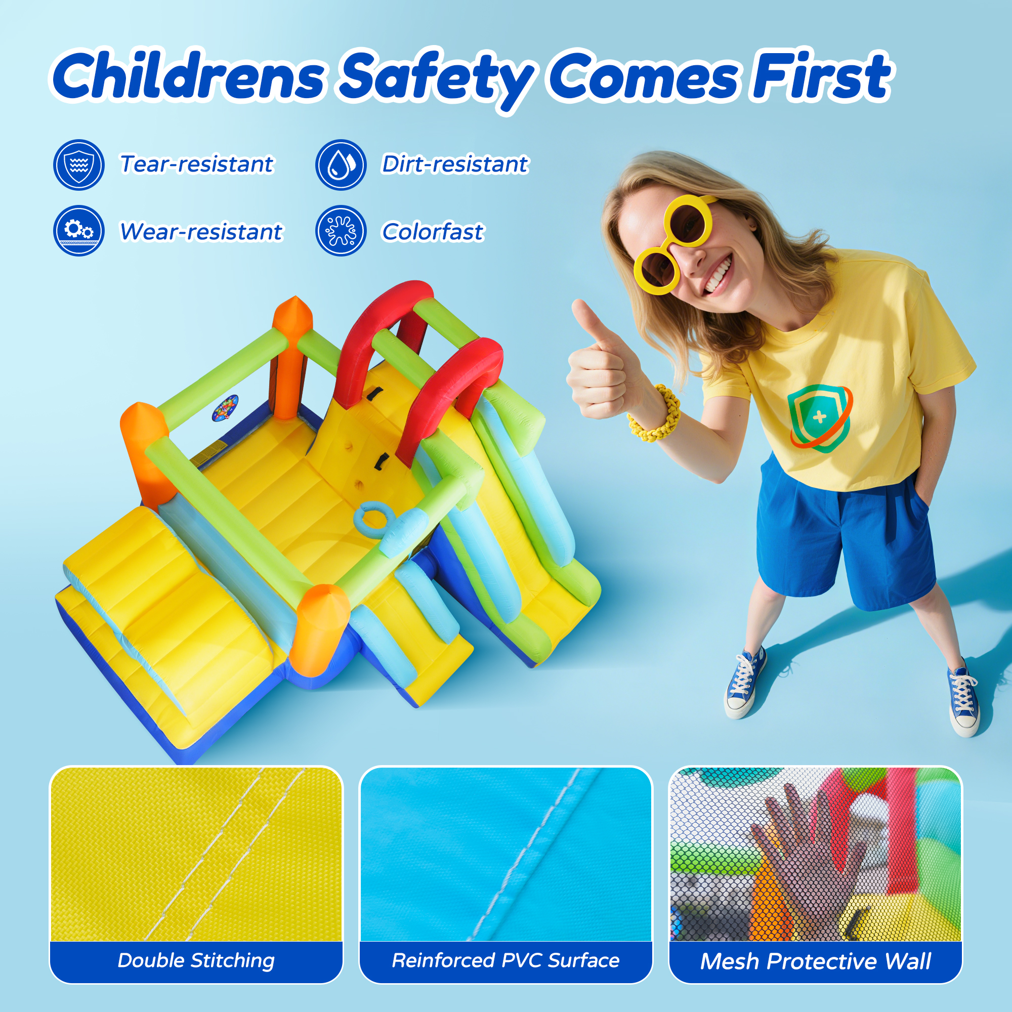 🏖️7-in-1 Large Inflatable Bounce House, suitable for children aged 3-10. Constructed with ultra-thick 840D + 420D PVC-coated Oxford fabric. Quickly inflates in 2-3 minutes using the included blower. The perfect gift for your child.