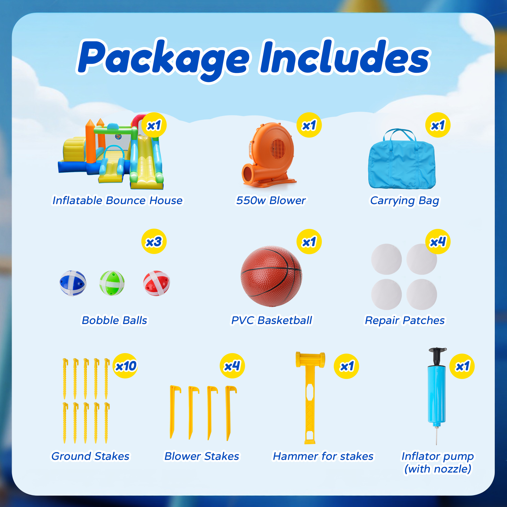 550W blower*1;carrying bag*1;bobble balls*3;PVC basketball*1;repair patches*4;Ground Stakes*10;blower stakes*4;Hammer for stakes*1;inflator pump*1(The castle is equipped with a 450W fan, providing powerful and stable wind to keep the structure upright during use.)