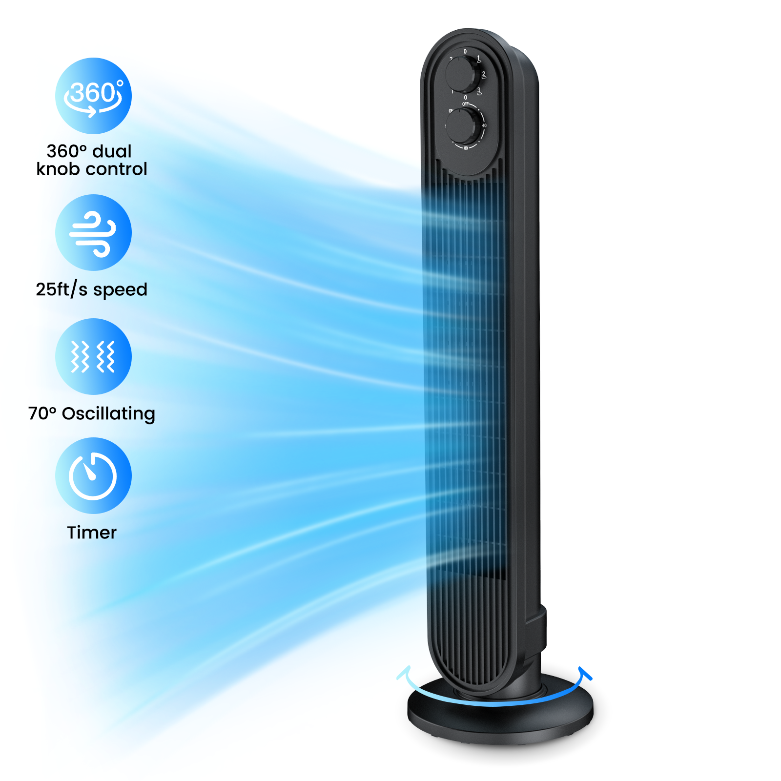 - It features a 360° dual-knob control system for easy operation and powerful motor that produces a maximum air velocity of 25 feet per second. With noise levels as low as 34dB, it won’t interfere with your daily activities or rest. Concealed handle on the back of the fan body allows you to move it easily. In addition, the tower fan’s timer function and extra-wide oscillation angle allow for large air circulation. The entire room is cooled quickly, refreshing every inch of the room!
