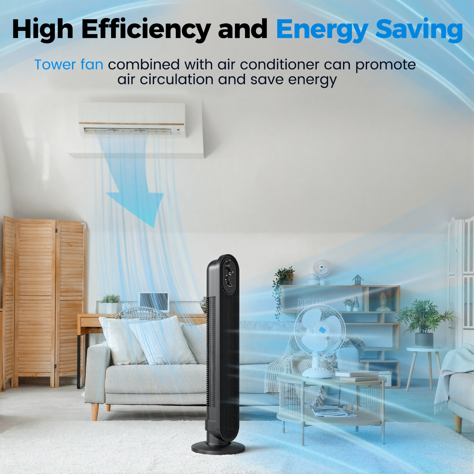- The tower fan is equipped with a convenient timing function. You can simply adjust the timer,ensuring a comfortable and energy-efficient breeze without having to worry about turning it off manually.