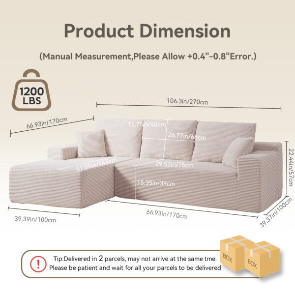 - 2 Packages: The modular sofa will be shipped in 2 separate packages, which may arrive at different times. If you have any questions about the Cloud Modular Sofa or need assistance, please contact us promptly.