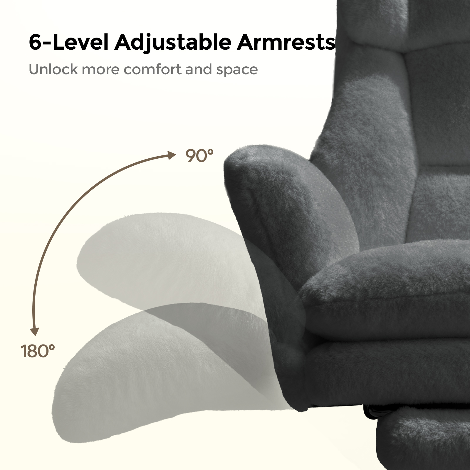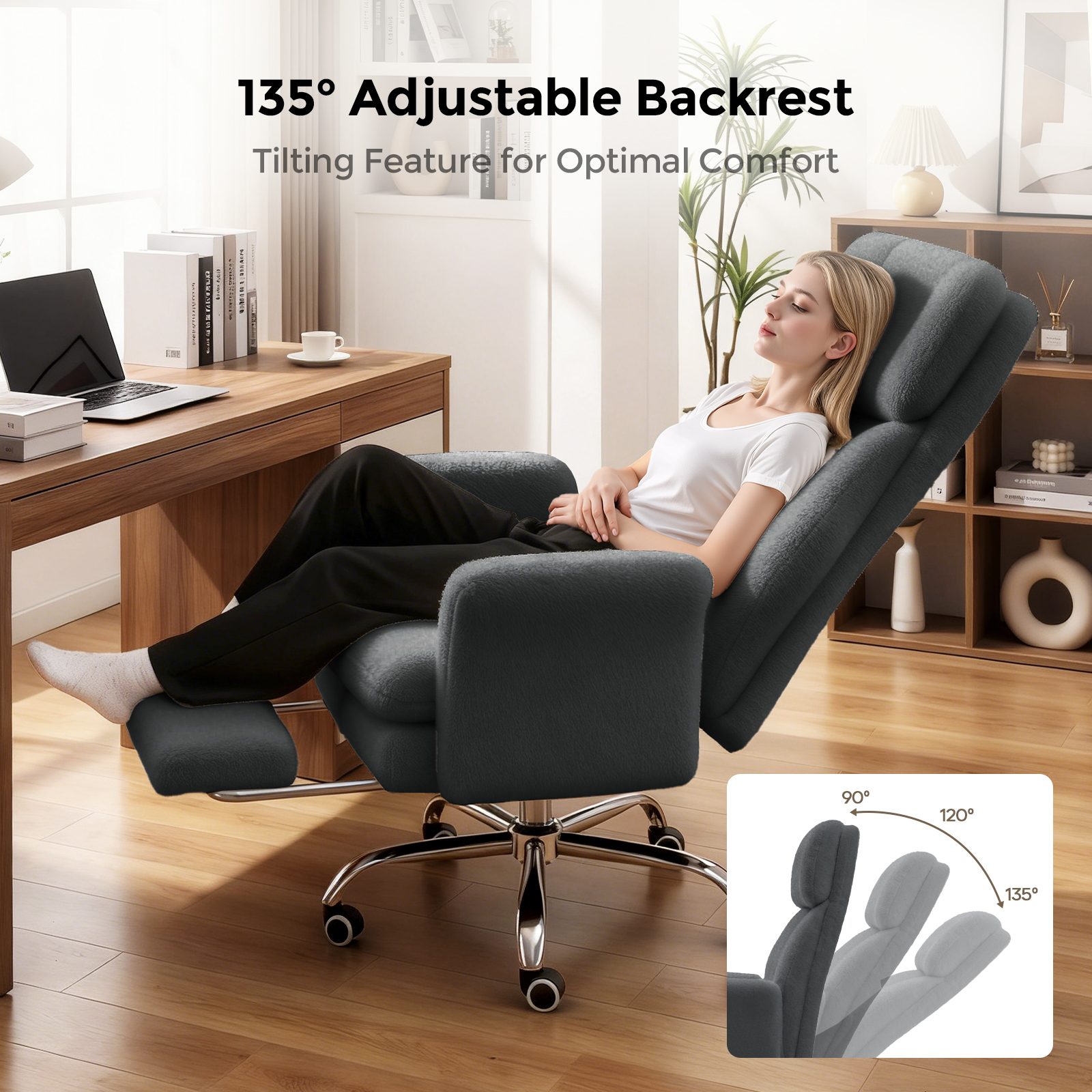 This beige plush office chair upgrades your office or study, blending ergonomic practicality and cloud-like comfort for pleasant long work hours. The office chair, with an ergonomic structure and lumbar support, prevents prolonged sitting discomfort and protects your waist and back. The office chair, equipped with a 135° adjustable backrest, lets you switch freely between work and rest, relieving waist-back pressure. The plush office chair also has 6-level adjustable armrests, customizable to your desk and posture to support arms or shoulders and reduce work/gaming fatigue. The 360° swivel lets you move freely for more efficient work. This big and tall office chair combines style, comfort and functionality—ideal for a cozy, practical office seat.