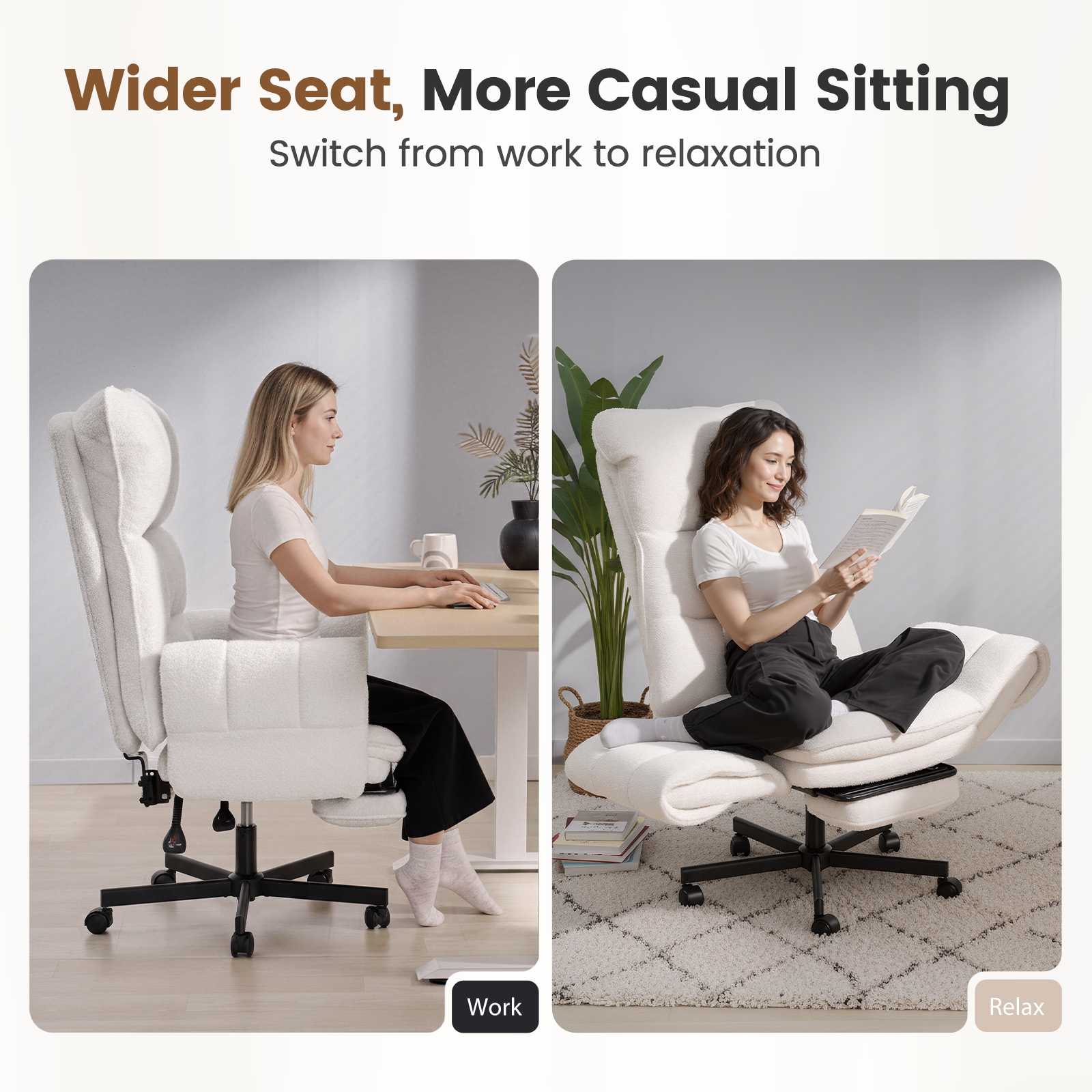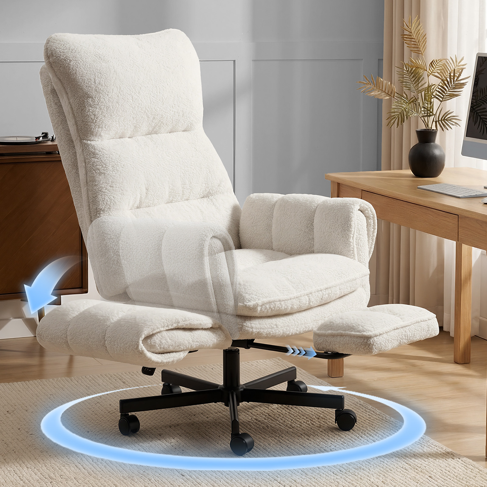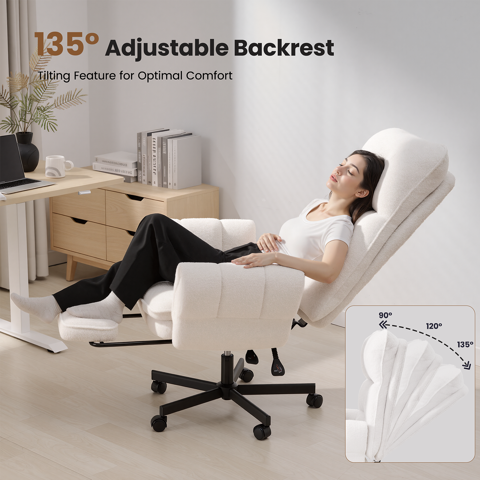 This beige Teddy office chair upgrades your office or study ,blending ergonomic practicality and cloud-like comfort for pleasant long work hours. The office chair ,with an ergonomic structure and lumbar support,prevents prolonged sitting discomfort and protects your waist and back. The office chair, equipped with a 135° adjustable backrest , lets you switch freely between work and rest, relieving waist-back pressure. The plush office chair also has 6-level adjustable armrests, customizable to your desk and posture to support arms or shoulders and reduce work/gaming fatigue. The 360° swivel lets you move freely for more efficient work. This big and tall office chair combines style, comfort and functionality—ideal for a cozy, practical office seat.