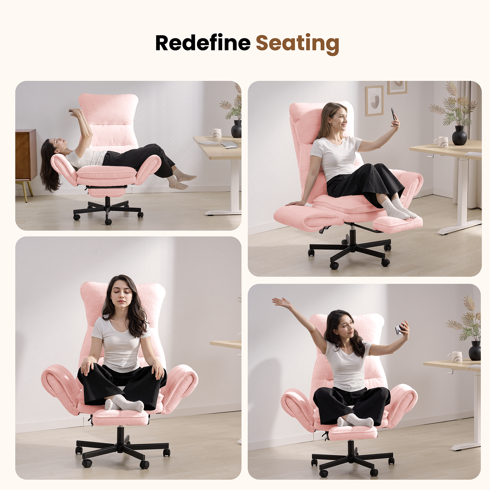 This beige Teddy office chair upgrades your office or study ,blending ergonomic practicality and cloud-like comfort for pleasant long work hours. The office chair ,with an ergonomic structure and lumbar support,prevents prolonged sitting discomfort and protects your waist and back. The office chair, equipped with a 135° adjustable backrest , lets you switch freely between work and rest, relieving waist-back pressure. The plush office chair also has 6-level adjustable armrests, customizable to your desk and posture to support arms or shoulders and reduce work/gaming fatigue. The 360° swivel lets you move freely for more efficient work. This big and tall office chair combines style, comfort and functionality—ideal for a cozy, practical office seat.
