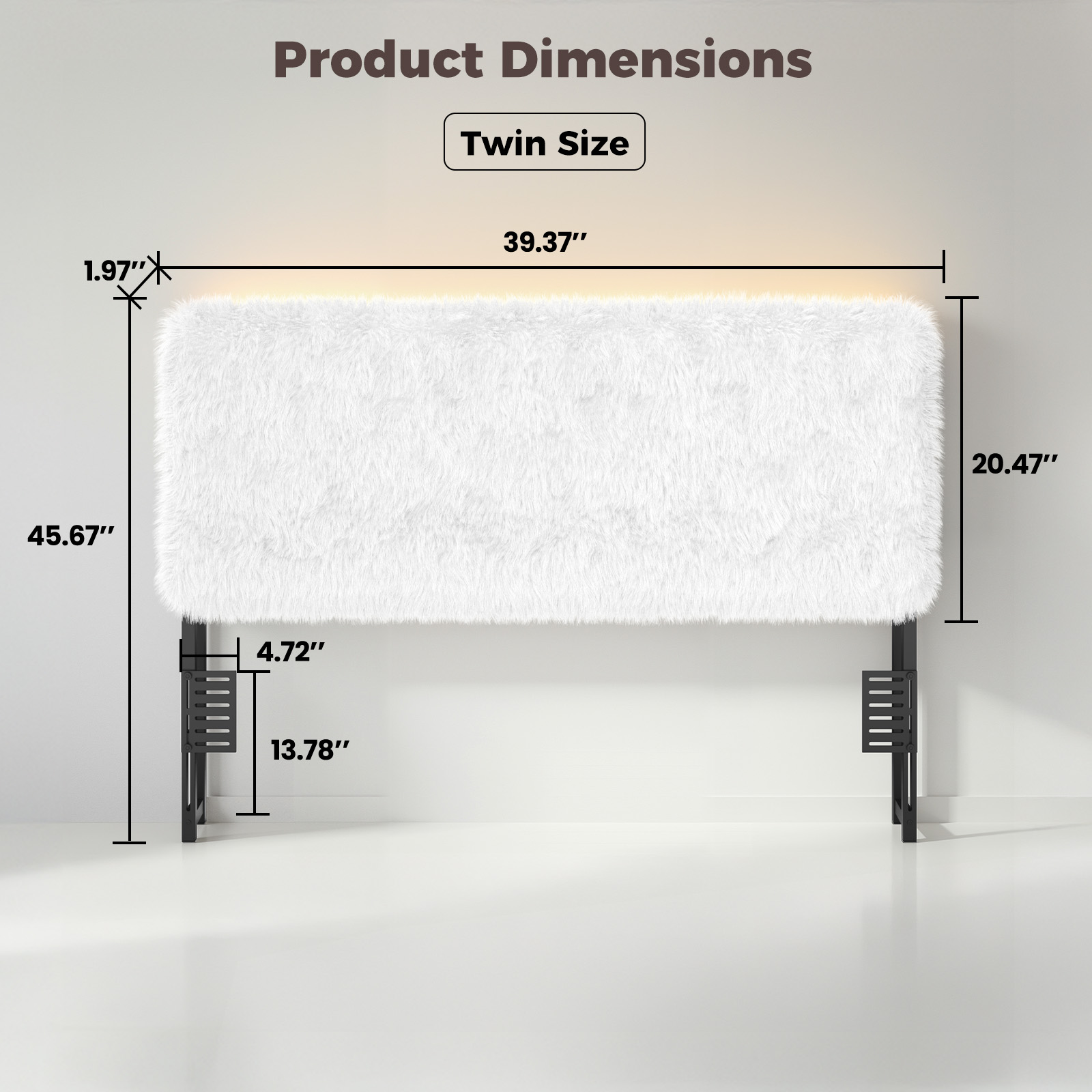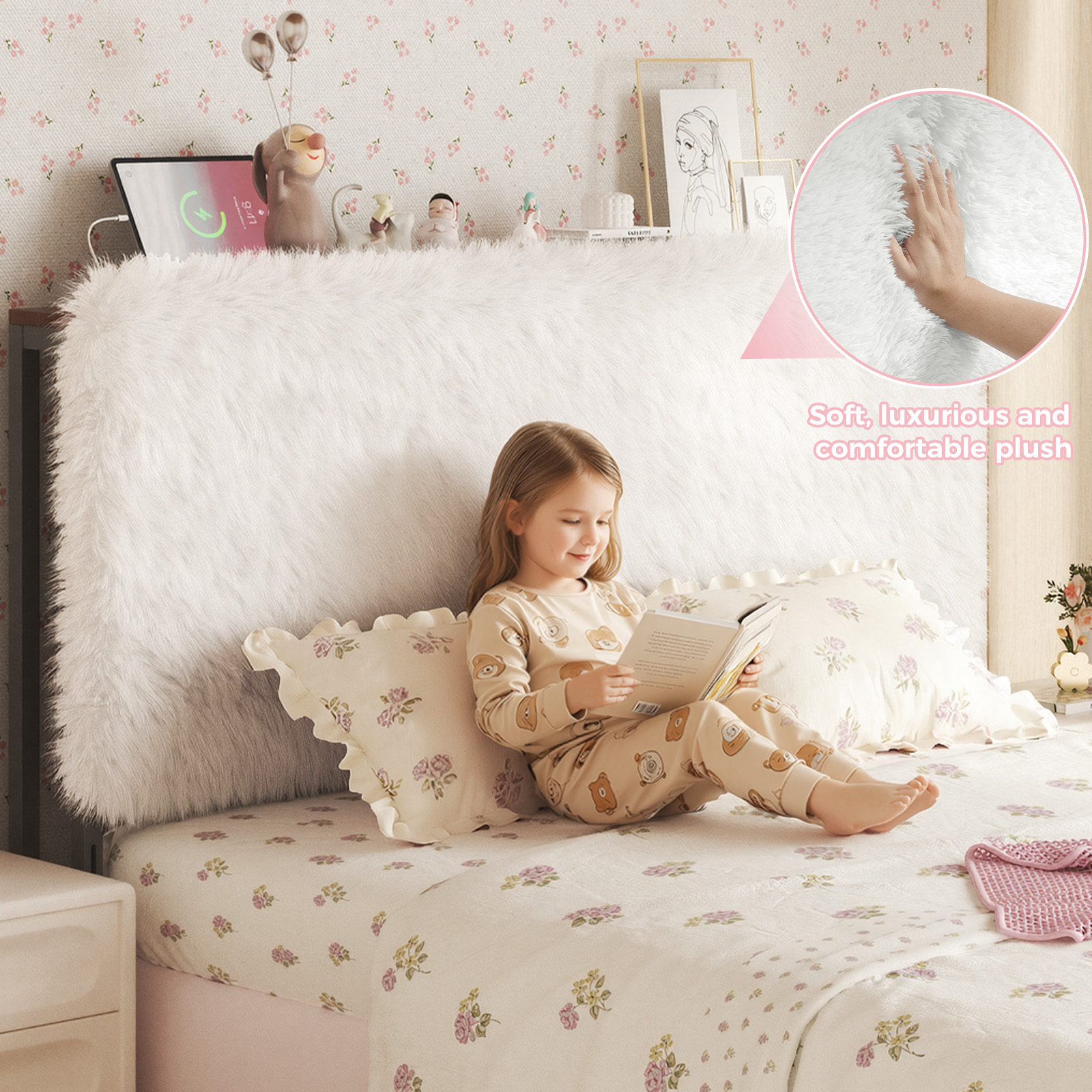The premium beige plush headboard elevates your bedroom with comfort, functionality and exquisite plush craftsmanship. This plush headboard features soft, skin-friendly plush fabric that wraps you in warmth, while its tufted design adds classic luxury to the plush headboard’s look. Equipped with fantasy RGB LED lights, the plush headboard offers app-controlled color modes (easy brightness/color adjustments) to create a romantic atmosphere around the headboard. The plush headboard also has integrated storage with a charging station, ( 1 x USB C Port and 1 x USB A Port), keeping small items organized at the headboard and devices conveniently charged. Built with a reinforced wooden frame, this plush headboard ensures elasticity, deformation resistance and durability, making the headboard a reliable bedroom addition. With adjustable height, the plush headboard fits all bed frames, most beds and various mattress-box spring combinations.