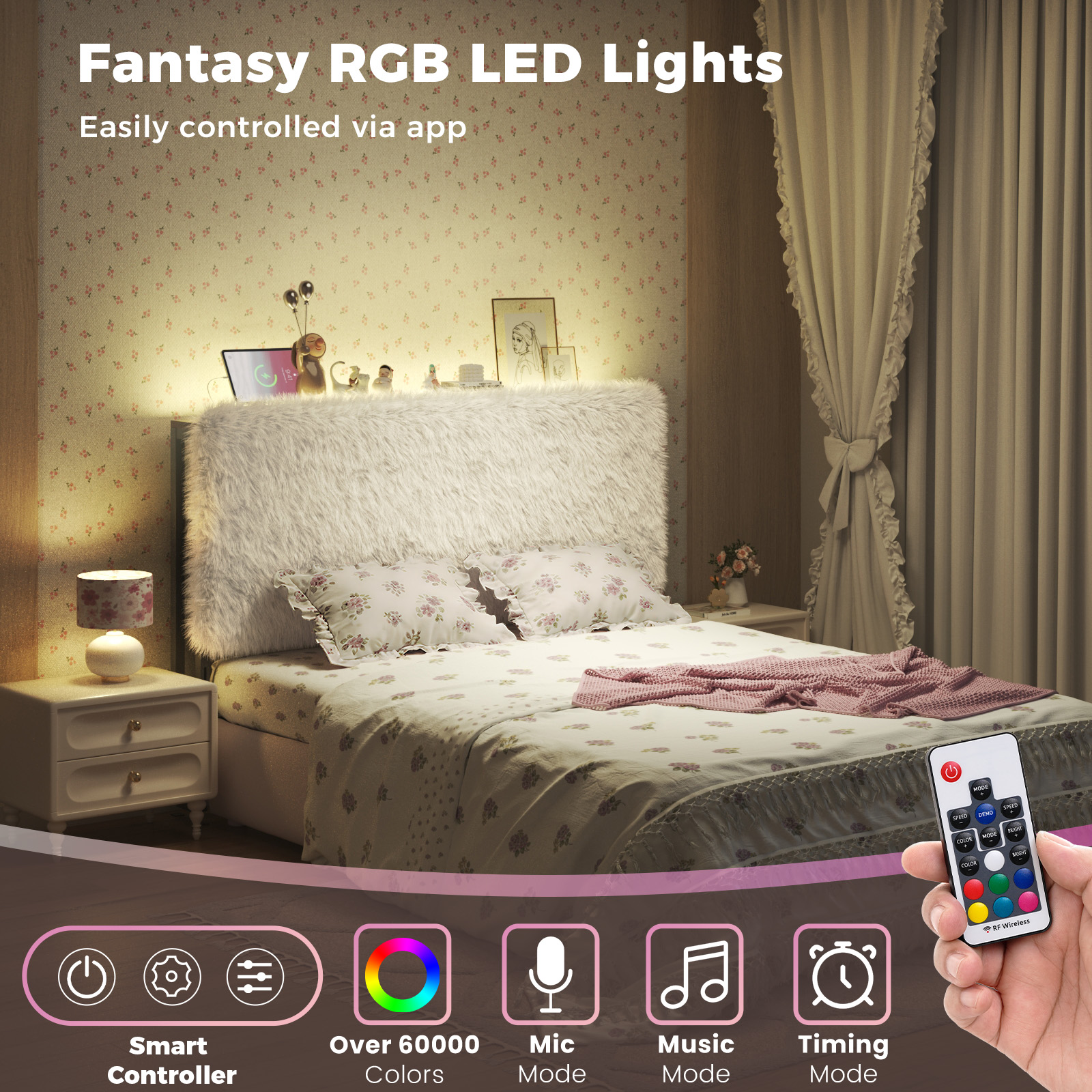 - 【Built-in Hidden LED Light Strip】 Equipped with fantasy RGB LED lights, offering various colorful light modes to create a romantic and cozy bedroom atmosphere. Easily controlled via app, convenient to adjust brightness and light colors anytime.