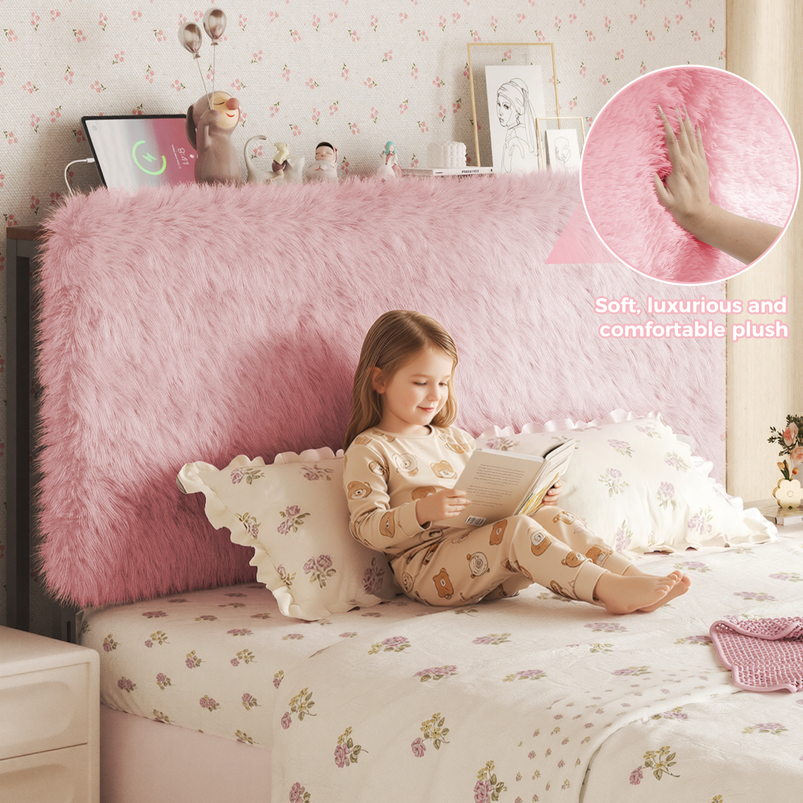 The premium beige plush headboard elevates your bedroom with comfort, functionality and exquisite plush craftsmanship. This plush headboard features soft, skin-friendly plush fabric that wraps you in warmth, while its tufted design adds classic luxury to the plush headboard’s look. Equipped with fantasy RGB LED lights, the plush headboard offers app-controlled color modes (easy brightness/color adjustments) to create a romantic atmosphere around the headboard. The plush headboard also has integrated storage with a charging station, ( 1 x USB C Port and 1 x USB A Port), keeping small items organized at the headboard and devices conveniently charged. Built with a reinforced wooden frame, this plush headboard ensures elasticity, deformation resistance and durability, making the headboard a reliable bedroom addition. With adjustable height, the plush headboard fits all bed frames, most beds and various mattress-box spring combinations.