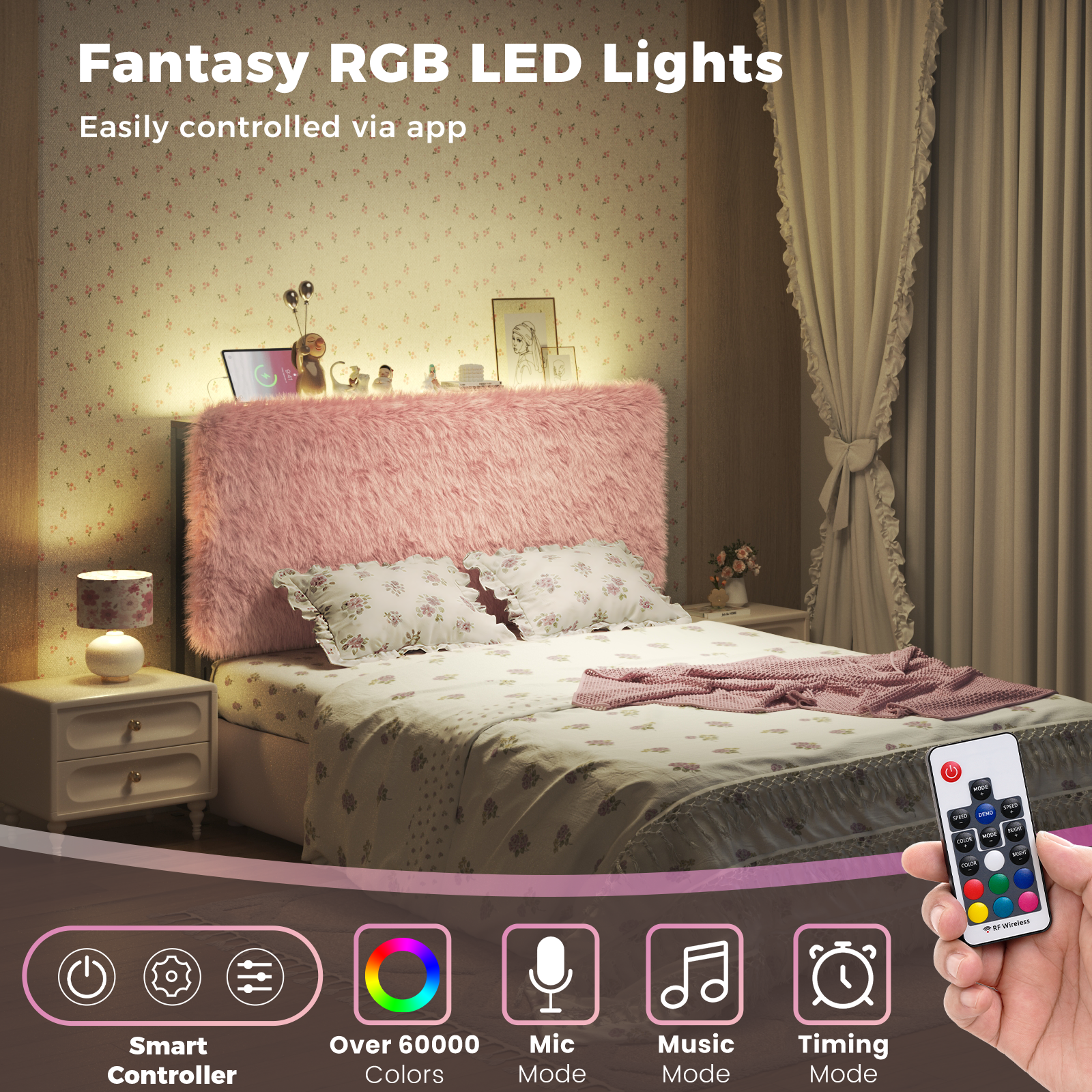 - 【Built-in Hidden LED Light Strip】 Equipped with fantasy RGB LED lights, offering various colorful light modes to create a romantic and cozy bedroom atmosphere. Easily controlled via app, convenient to adjust brightness and light colors anytime.