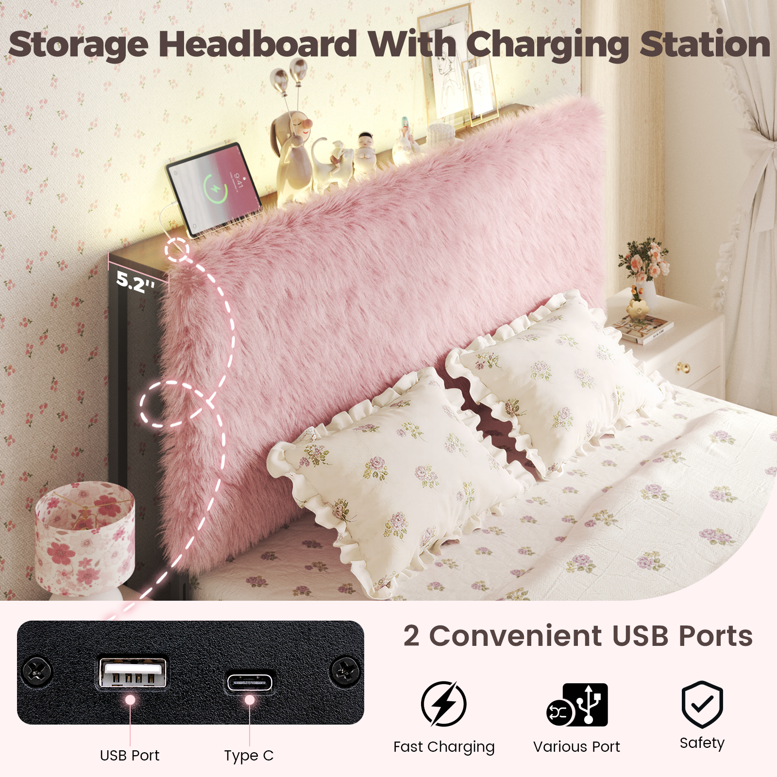 - 【Storage Headboard with Charging Station】Integrated storage design with a built-in charging station ( 1 x USB C Port and 1 x USB A Port), making it very convenient to charge your electronic devices within your reach or use a book light to easily read while lying in bed. No need to worry low battery.