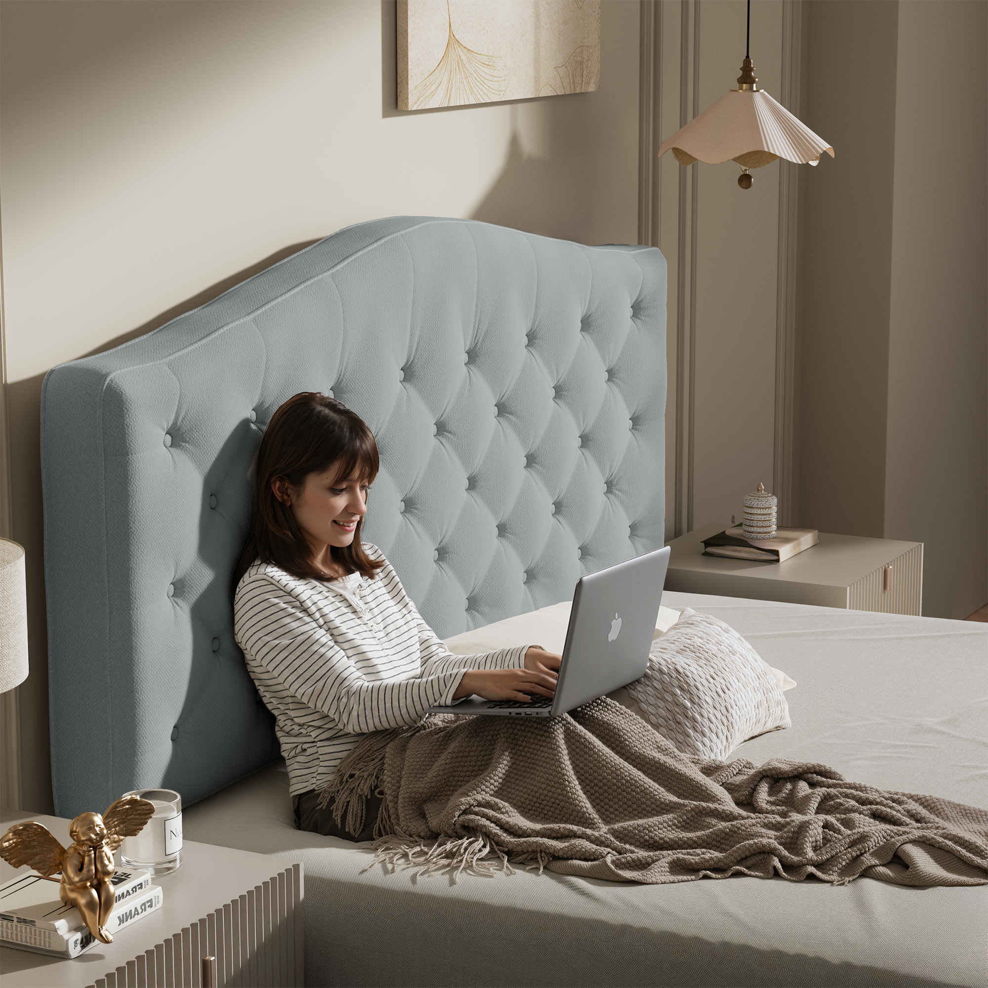 【Elegant Button-Tufted Upholstery】Features classic luxury button-tufted detailing in a soft beige fabric, elevating bedroom aesthetics while resisting wrinkling and maintaining a polished look.