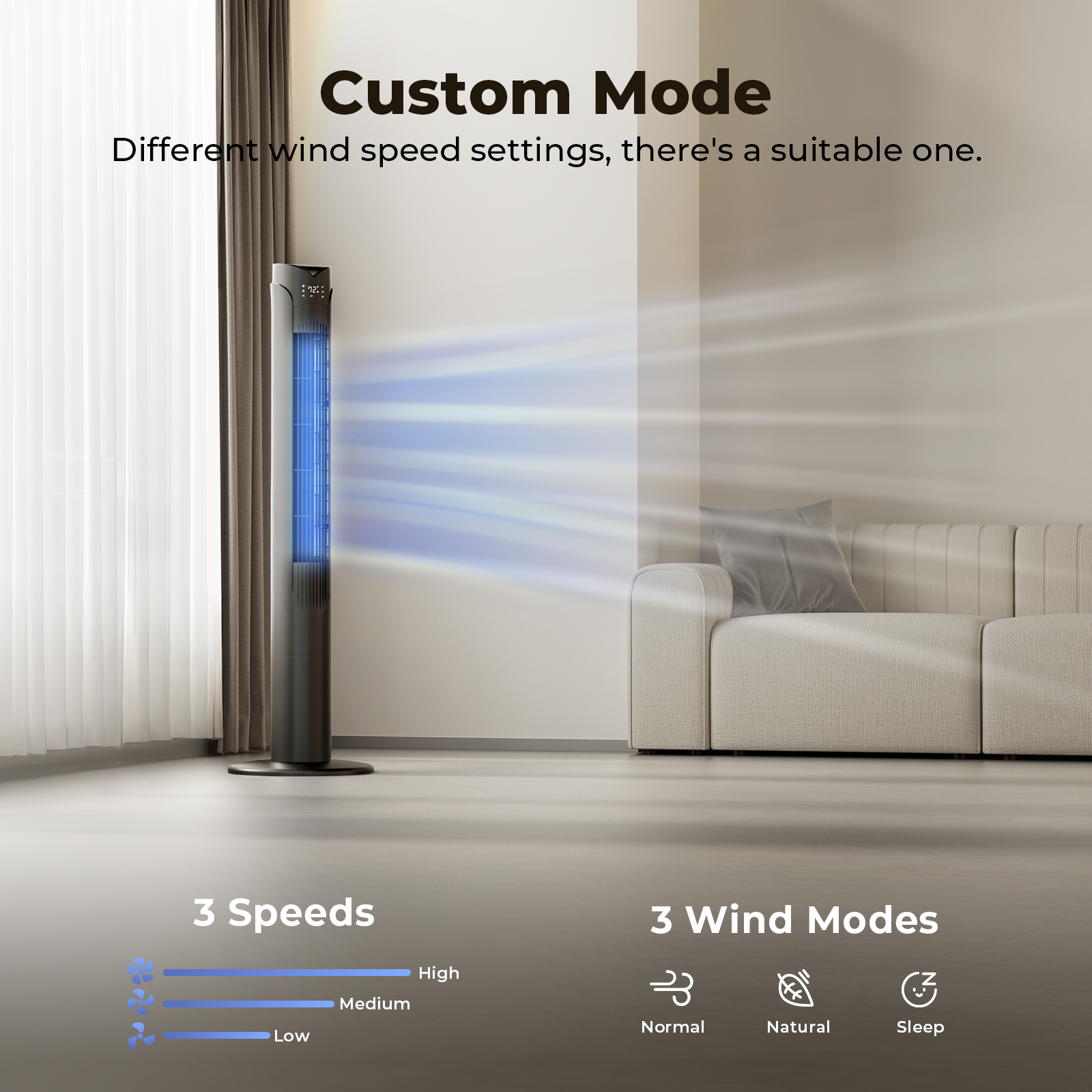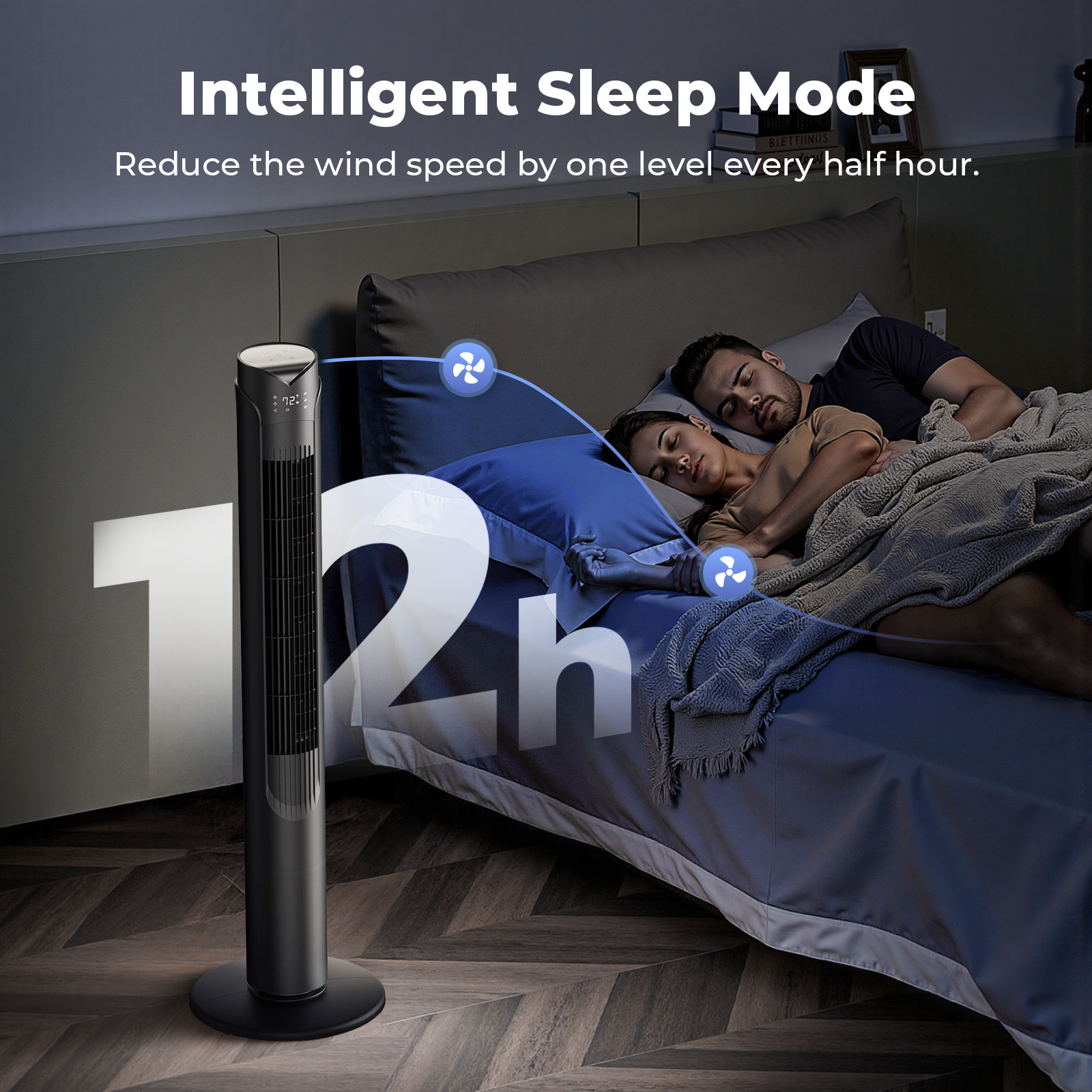 - Enjoy a wide range of wind speeds including normal, natural and even sleep winds. The tower fan automatically adjusts the wind speed for your comfort, and the 1-12 hour timer ensures a peaceful night and saves energy.