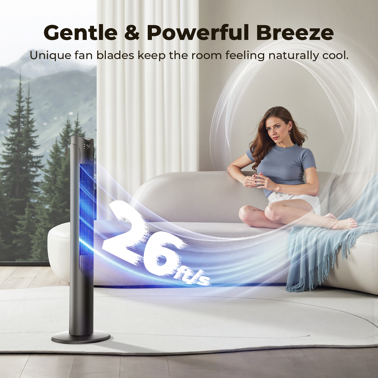- The tower fan has a super-powerful motor with a wind speed of up to 26ft/s, achieving immediate cooling. The tower fan is 41″ tall, which is both stylish and practical.