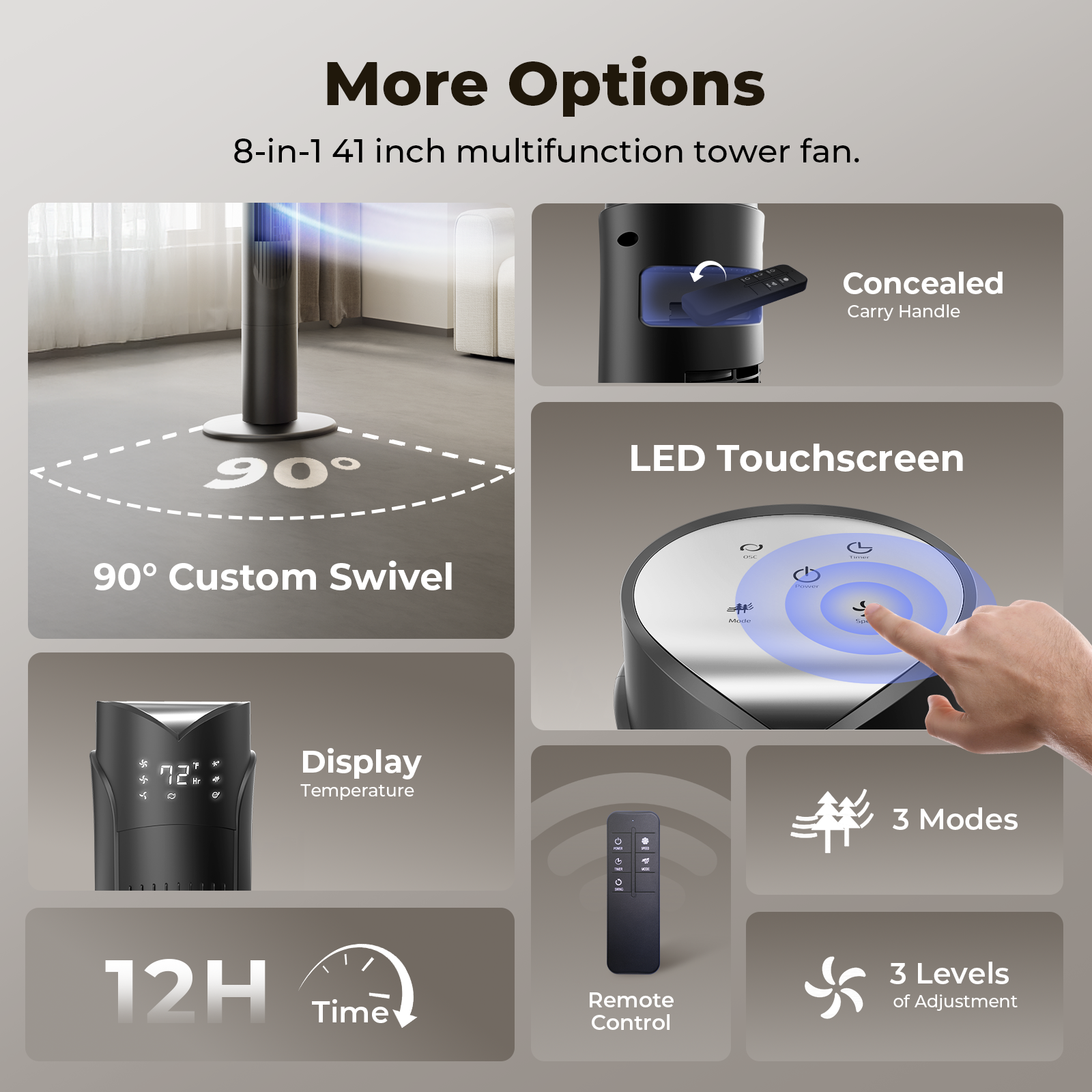 - 📏 41-inch ergonomic height + hidden handle ➜ Airflow aligns with sitting/lying postures; handle seamlessly integrates for effortless, elegant movement