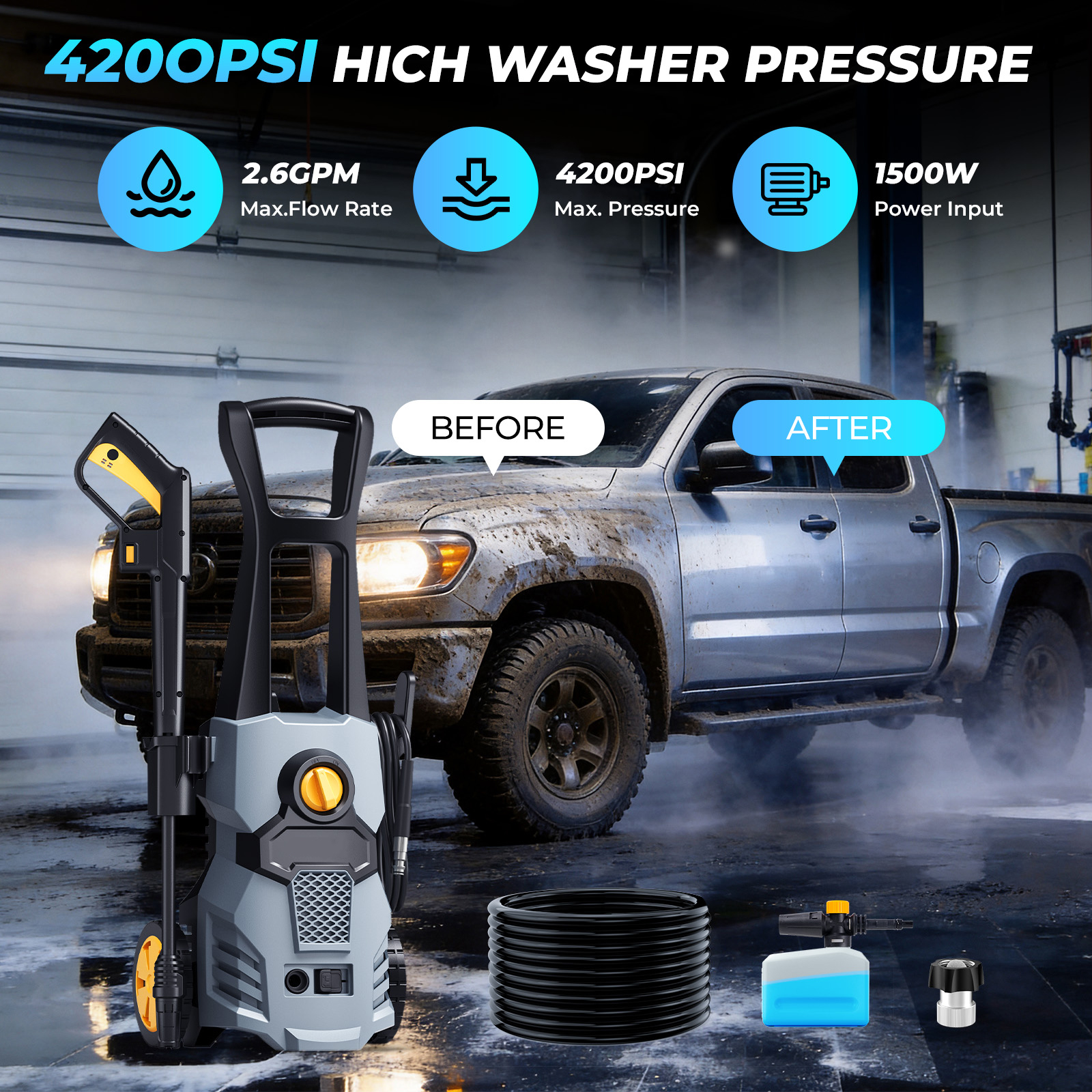 - ✅High-Efficiency Cleaning: This pressure washer delivers 4200 PSI of high pressure and 2.6 GPM water flow to effortlessly remove stubborn grime. It provides deep, effective cleaning on various materials and surfaces, making it ideal for driveways, patio furniture, fences, cars, homes, and more—while using less water than a traditional hose.