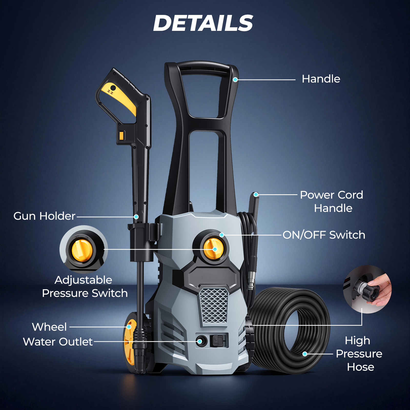 - ✅Easy to Use and Move: This portable pressure washer comes with a 23FT hose and a 13FT power cord, providing ample freedom of movement. Its dual-wheel design ensures smooth, durable, and effortless maneuverability. The anti-tip body design enhances stability during use. Additionally, it can be connected to a faucet or used with a bucket, allowing you to clean spaces anytime, anywhere.