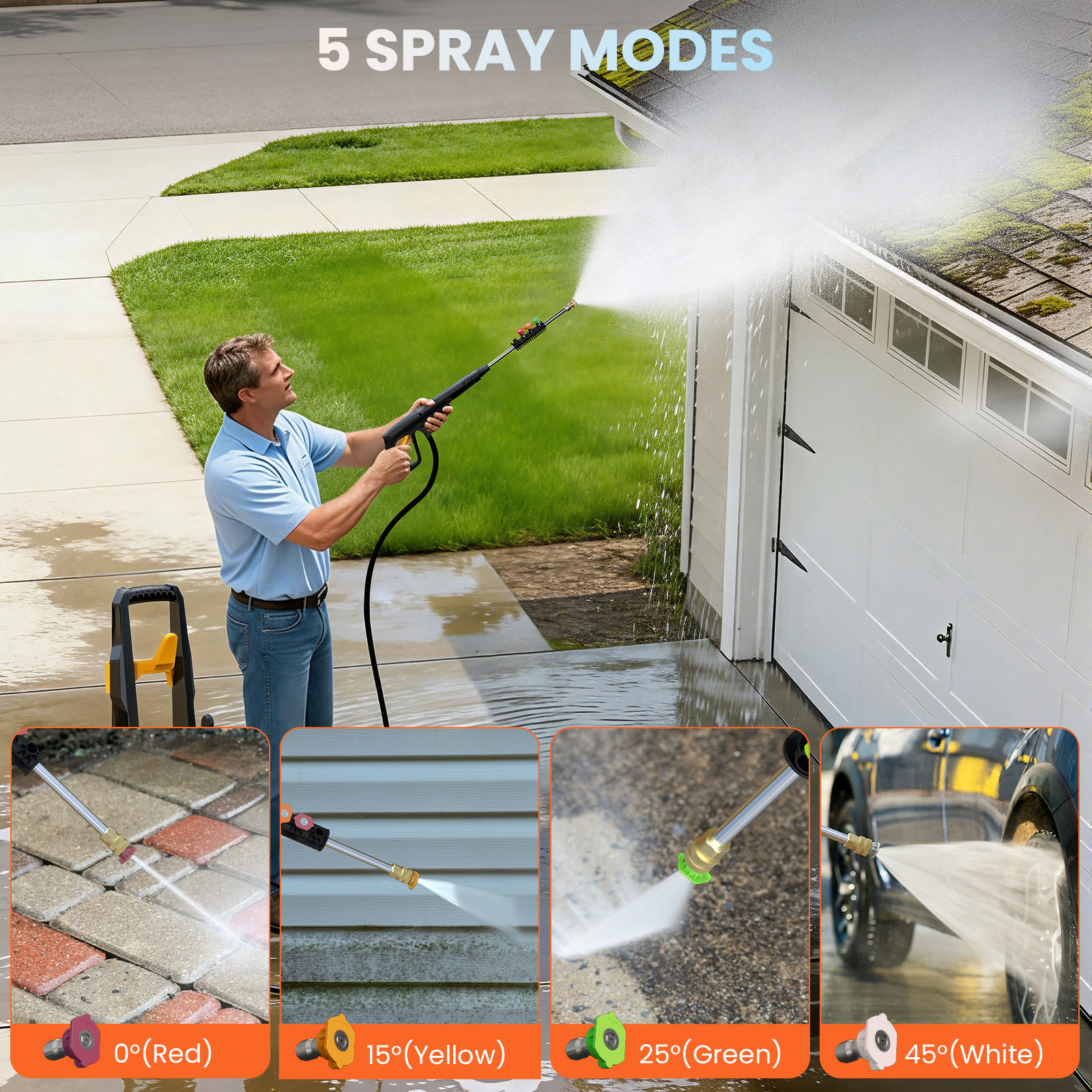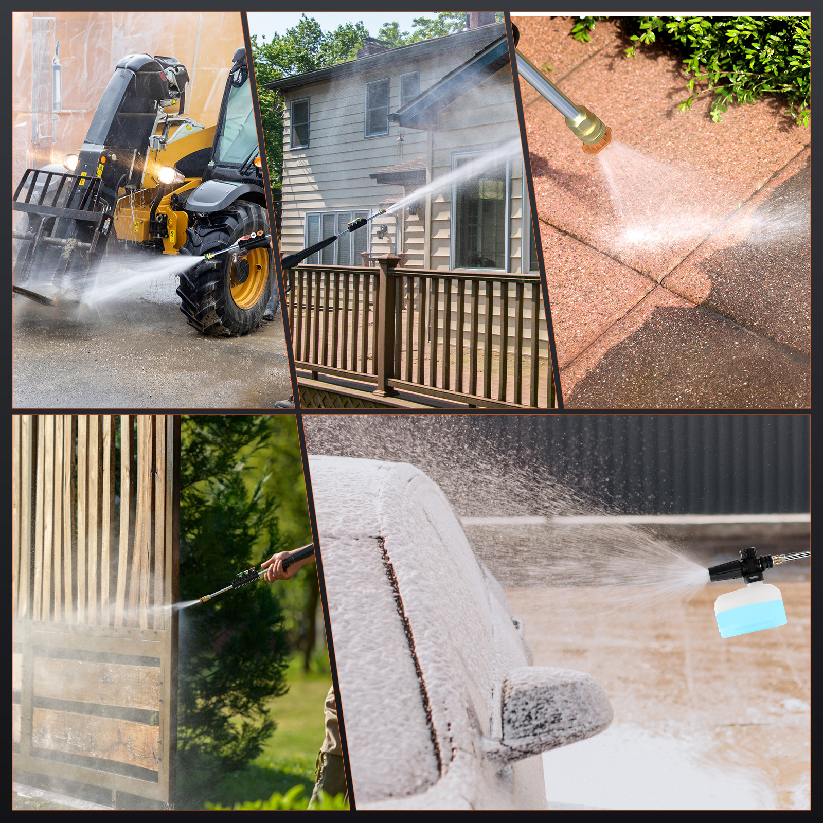 - 4 Universal Quick Connect Tips: The 0° tip delivers super high pressure for dissolving stubborn substances on hard surfaces; The 15° tip delivers high pressure for concrete and brick with hard surfaces; The 25° tip delivers medium pressure for wood decks and sidings with soft surfaces; The 40° tip provides low pressure for windows and screens with fragile surfaces; The attached 500ml foam cannon can produce rich bubbles to wash your car