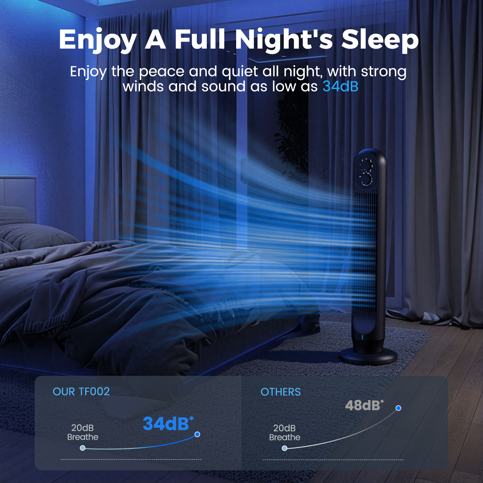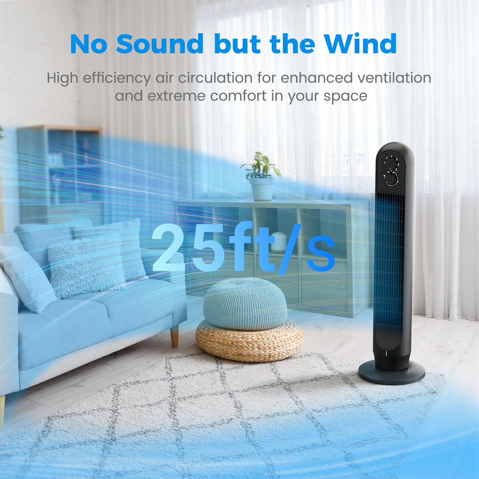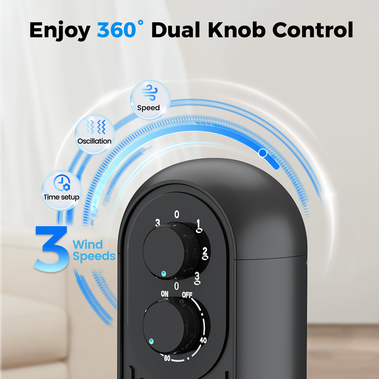 It features a 360° dual-knob control system for easy operation and powerful motor that produces a maximum air velocity of 25 feet per second. With noise levels as low as 34dB, it won’t interfere with your daily activities or rest. Concealed handle on the back of the fan body allows you to move it easily. In addition, the tower fan’s timer function and extra-wide oscillation angle allow for large air circulation. The entire room is cooled quickly, refreshing every inch of the room!