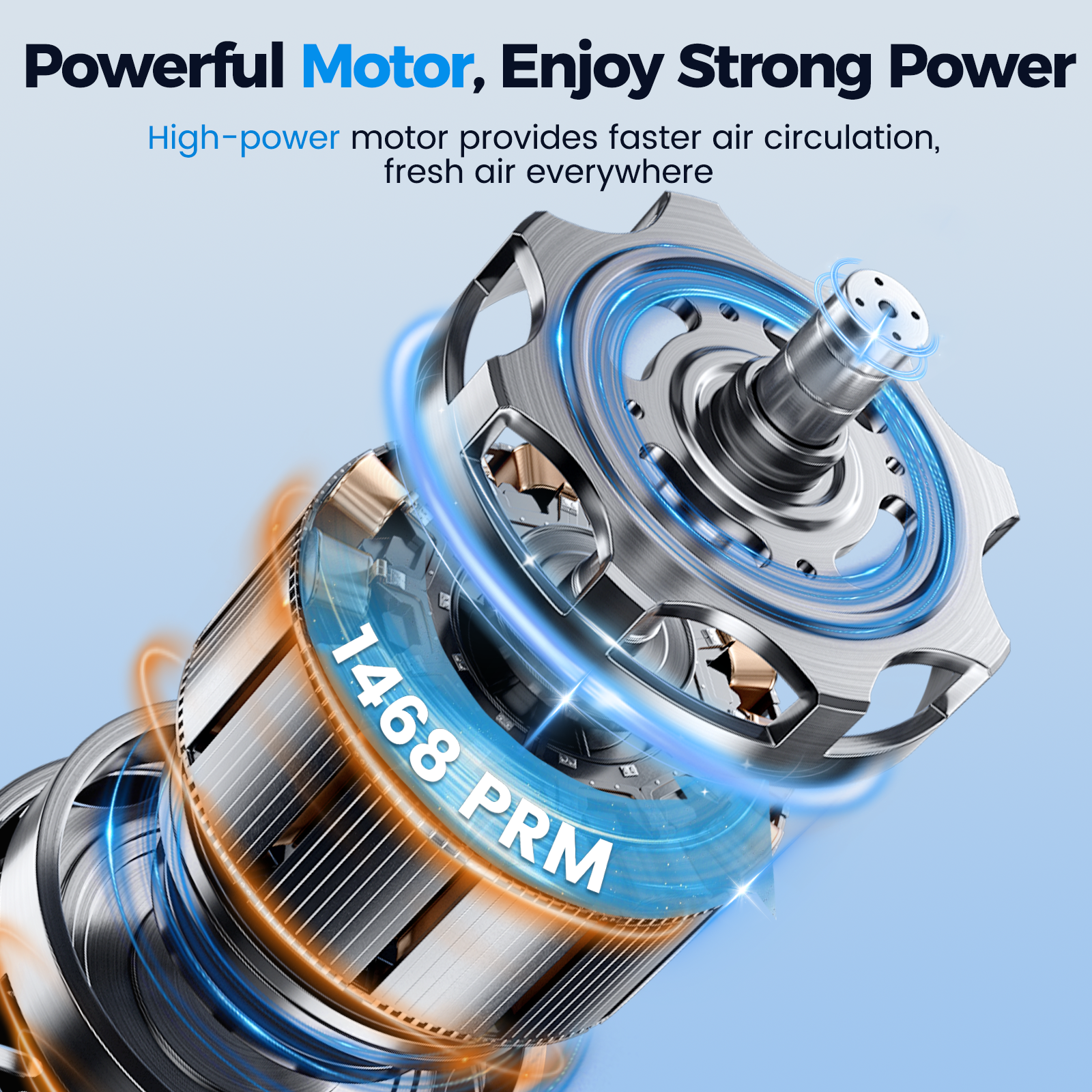 The powerful household fan has a powerful motor, with a speed of up to 1468RPM, and a maximum wind speed of 25ft/s. It can quickly cool down a large room or a stuffy room, accelerate indoor air circulation, and easily dissipate heat.