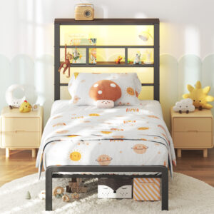 Bed Frame with 49.2‘ High LED Storage Headboard Frame, Metal Platform Bed, Black The perfect addition to any bedroom, it’s designed to meet a variety of your needs and comes in a variety of sizes for you to choose from.49.2’ High Headboard Provides plenty of support for your back and neck, making it more comfortable for you to read or play games. Multi-functional storage space meets all kinds of storage needs, and it’s convenient to put things on the bed as well. The design of crossbars on both sides prevents the mattress from sliding. The bed frame series will bring you an organised lifestyle, making everything look simpler and more cosy.