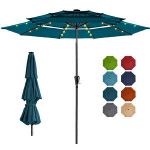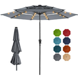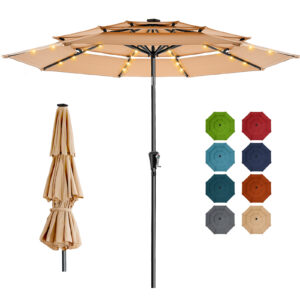 9ft 3-Tier Solar Patio Umbrella,Outdoor Market Sun Shade with 24 LED Lights for Backyard,Deck,Poolside,Tilt Adjustment,Easy Crank,8 Ribs