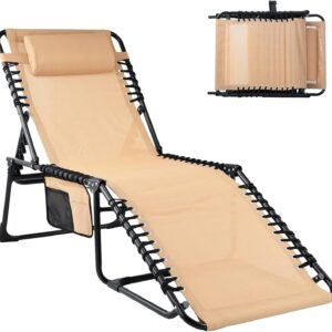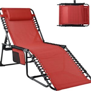 Folding Outdoor Chaise Lounge Chair – Beach Tanning Lounger with 5-Level Adjustable Backrest, 2-Level Footrest, Removable Pillow, Side Pocket, 330lb Weight Capacity for Poolside