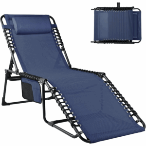 Folding Outdoor Chaise Lounge Chair – Beach Tanning Lounger with 5-Level Adjustable Backrest, 2-Level Footrest, Removable Pillow, Side Pocket, 330lb Weight Capacity for Poolside