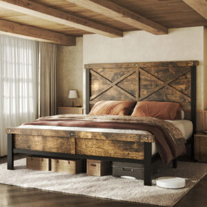 HOMRELEXA Farmhouse X-Frame Bed with Headboard and Footboard, Queen Size Bed Frame, No Box Spring Needed, Brown