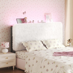 Patbrela Headboard for Twin Size, Upholstered Plush Head Board with LED Light and Charging Station, Adjustable Height, Pink